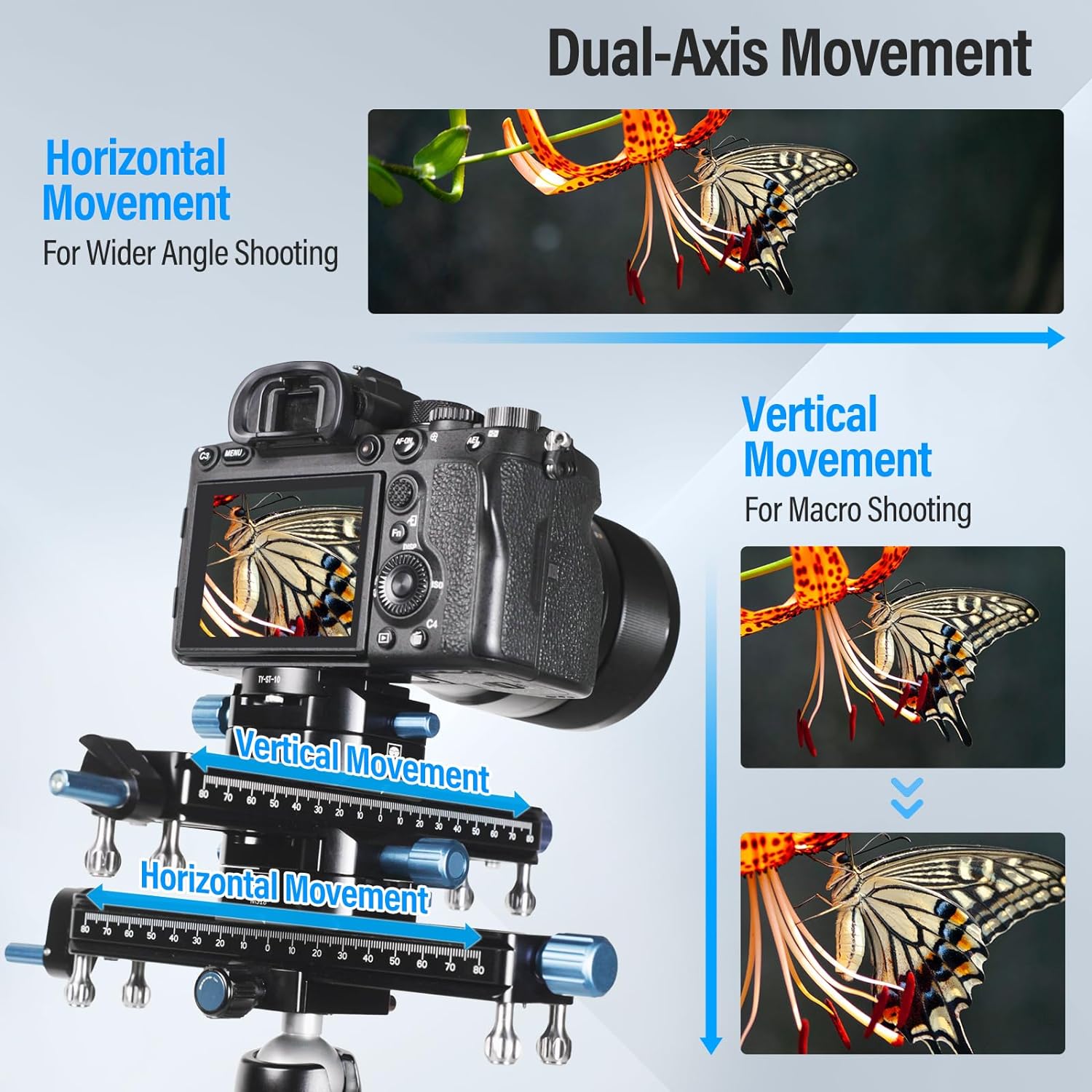 - 4-Wege-Anpassung: Mit dem integrierten Arca-Stil Schieberegler können Sie zwei Makroschienen stapeln, was eine vierfache Anpassung der Kamera ermöglicht. Darüber hinaus können Sie es über das untere 3/8-Zoll-Gewindeloch oder die integrierte