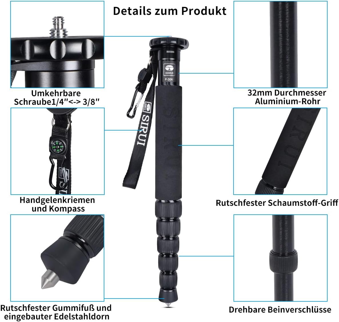 • Lieferumfang: Sirui P-306 Aluminum Einbeinstativ, Handschlaufe, Kompass, Karabiner