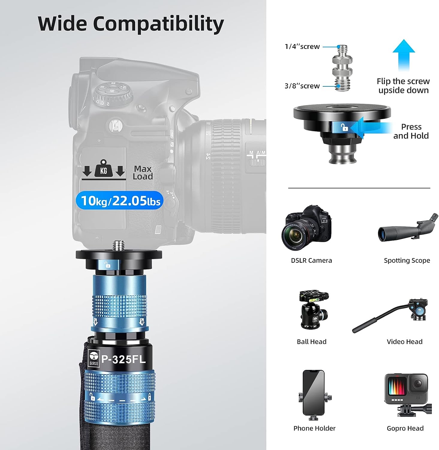 - Reisen mit leichtem Pack: Die Kohlefaserstruktur verleiht dem P-325FL Einbeinstativ ein Gewicht von nur 1,2 kg/2,65 bs, was 20% leichter ist als die Vorgängermodelle von Sirui. Mit einem Gewicht von etwa einer spiegellosen Kamera ist dieses