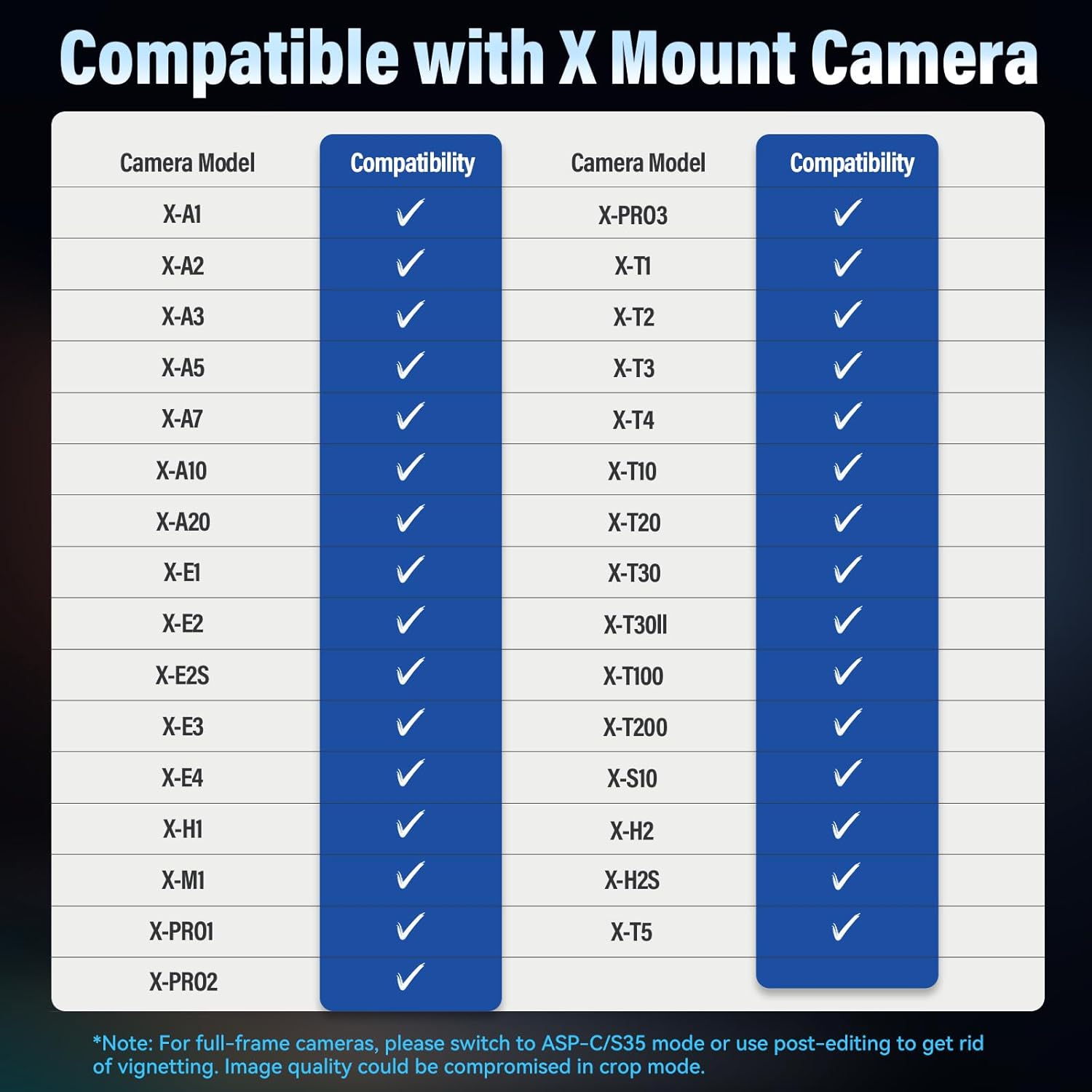 - Enthält eine blütenförmige Gegenlichtblende für 23 mm/33 mm Brennweitenobjektive und eine runde Gegenlichtblende für 56 mm Brennweitenobjektiv, um die Vignettierung zu reduzieren und unerwünschtes Streulicht vom Eindringen in das Objektiv zu