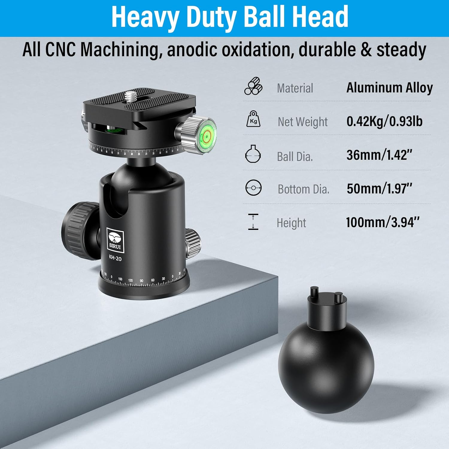 - Robustes Kugelkopf-Design: Der 36 mm Kugelkopf aus hochwertigem Aluminiumlegierung und die 50 mm grosse Basis bieten ausgezeichnete Stabilität und Tragfähigkeit. Er unterstützt Kameras, Camcorder und andere Geräte mit bis zu 20 kg Gewicht