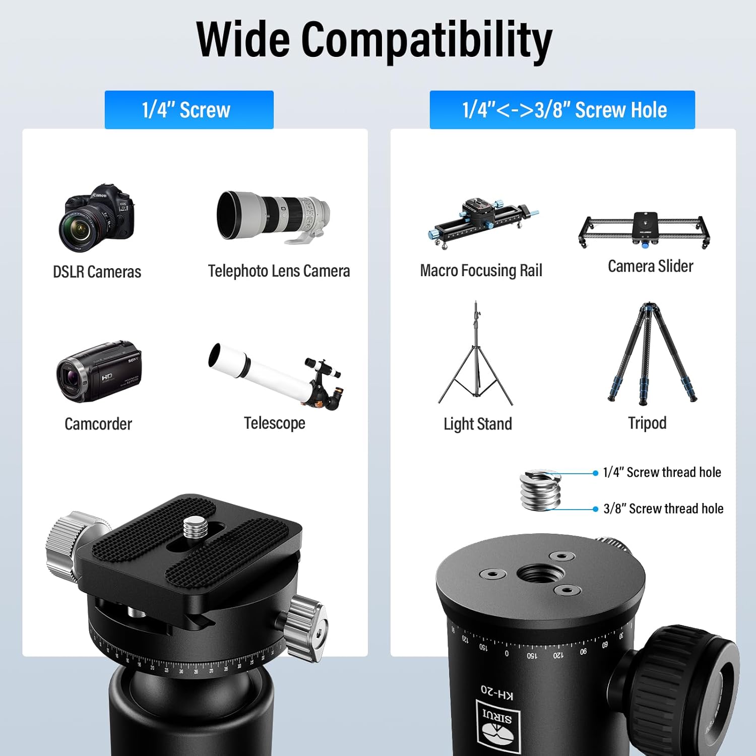 - Breite Kompatibilität: Die Schnellwechselplatte des Stativkopfs ist mit 1/4-Zoll-Schrauben ausgestattet und verfügt über ein 3/8-Zoll-Innengewinde an der Unterseite. Diese Vielseitigkeit macht den Kugelkopf kompatibel mit den meisten DSLR-Kameras,