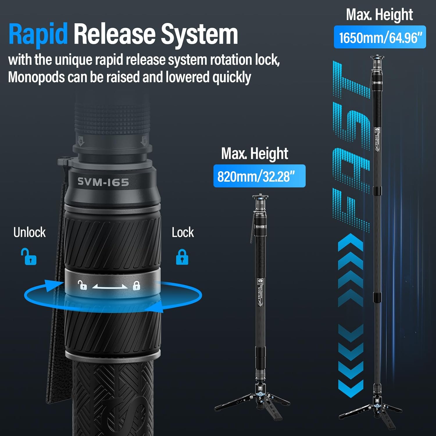 - Kohlefaser Einbeinstativ: SVM-165 Einbeinstativ mit 36 mm maximalem Rohr, wiegt 1,52 kg und belastet bis zu 10 kg, was ideal für Aktivitätsaufnahmen ist, wo Sie es leicht bewegen können, um Bilder im entsprechenden Winkel aufzunehmen.