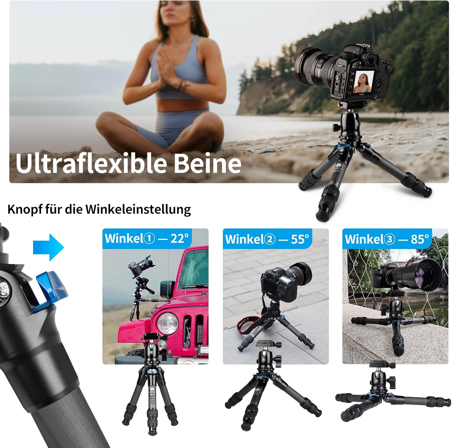 - Verstellbar und ausziehbar: 3-teilige Kohlefaser-Beine mit Schnellentriegelung ermöglichen es Ihnen, die Arbeitshöhe von 5,8 cm bis 35,1 cm einzustellen. Das 3-Positions-Beinwinkelverstellsystem bietet flexible Aufnahmen für verschiedene