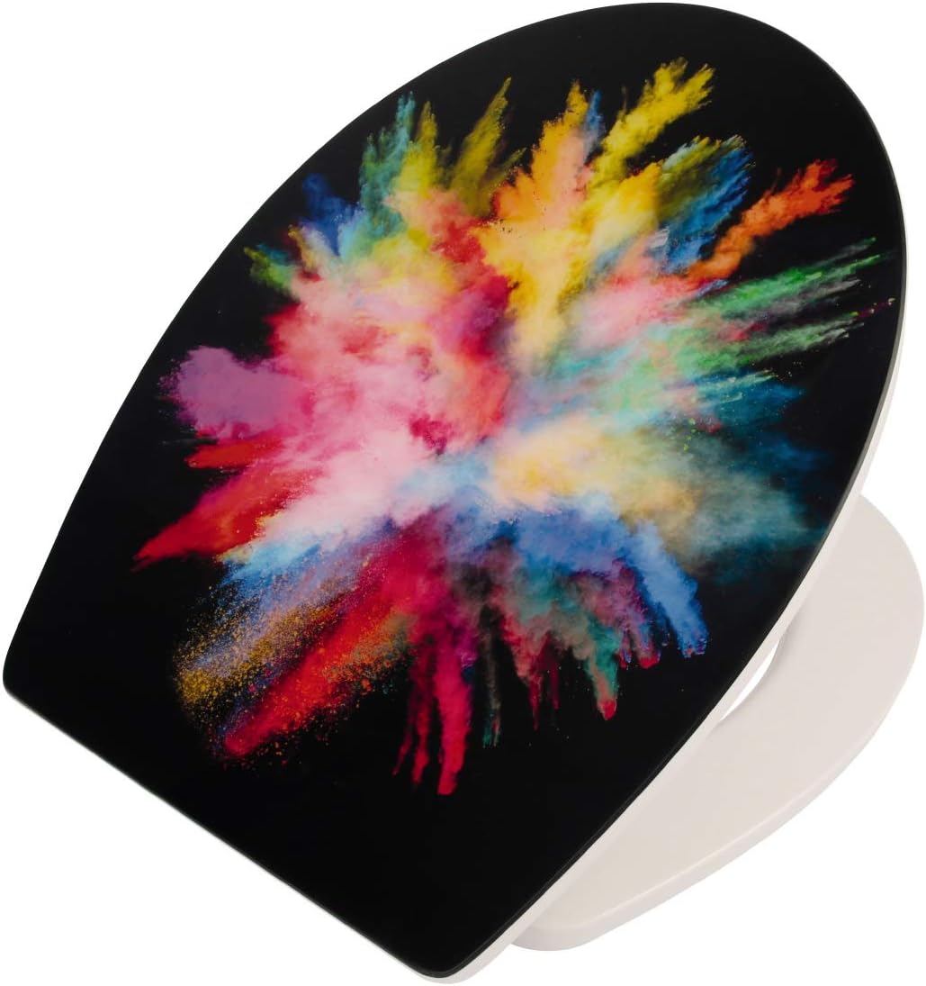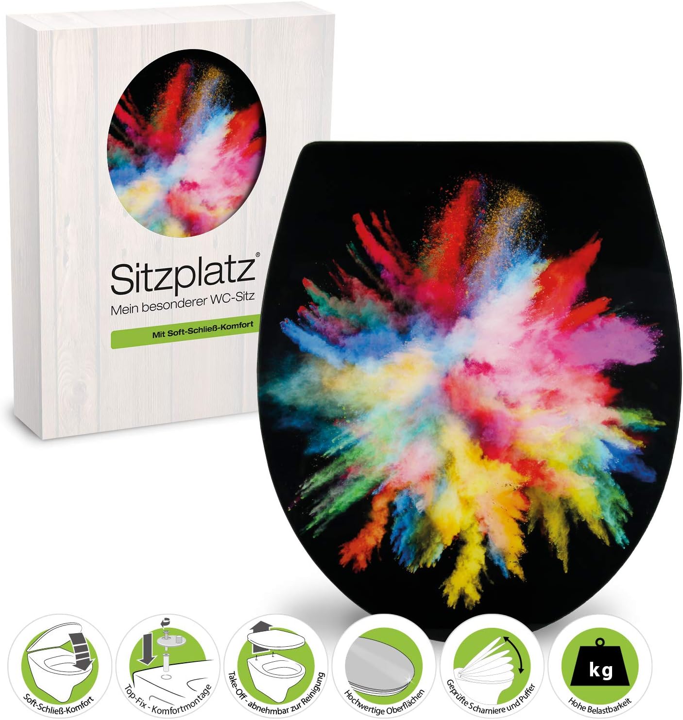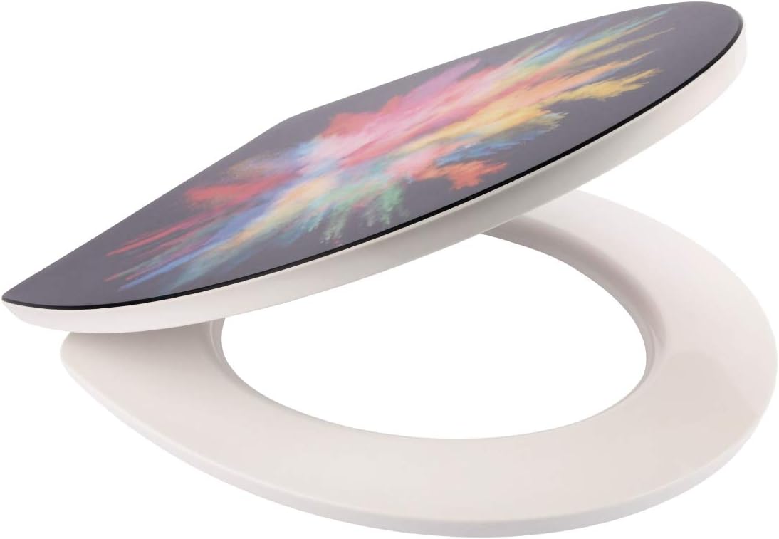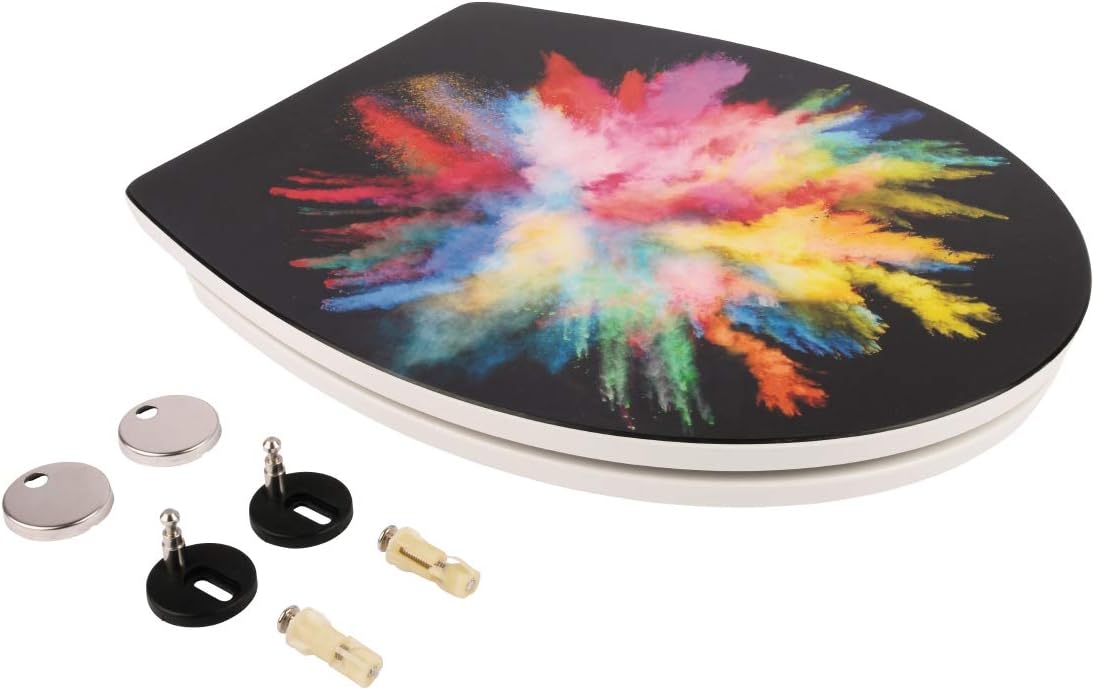 - ➤ WC-SITZ MOTIV FARBRAUSCH: • Aus antibakteriellem Duroplast • Mit Metall-Scharnieren • Geprüfte Belastbarkeit von Deckel & Brille: bis 150 kg • Universale Form • Absenkautomatik • Befestigung von oben: Top-Fix-System • Abnehmbar •