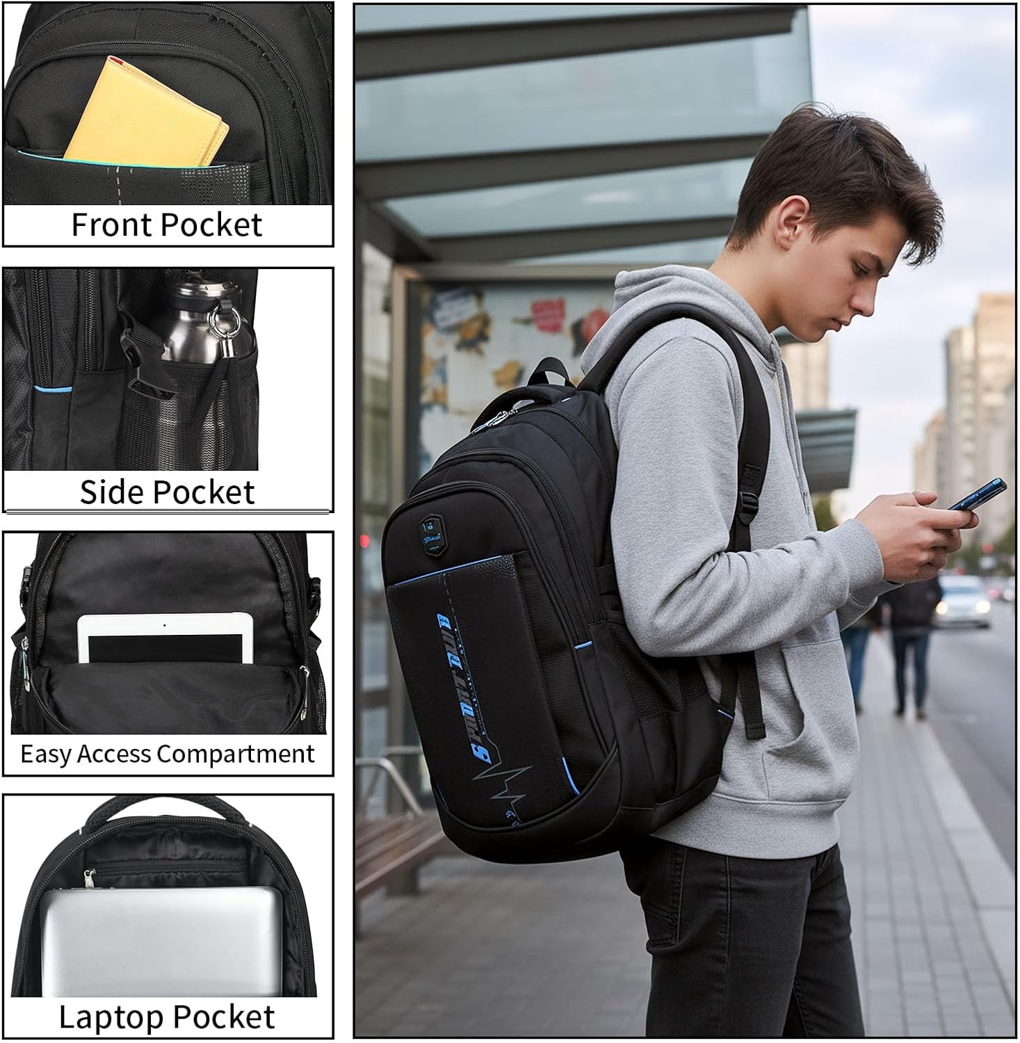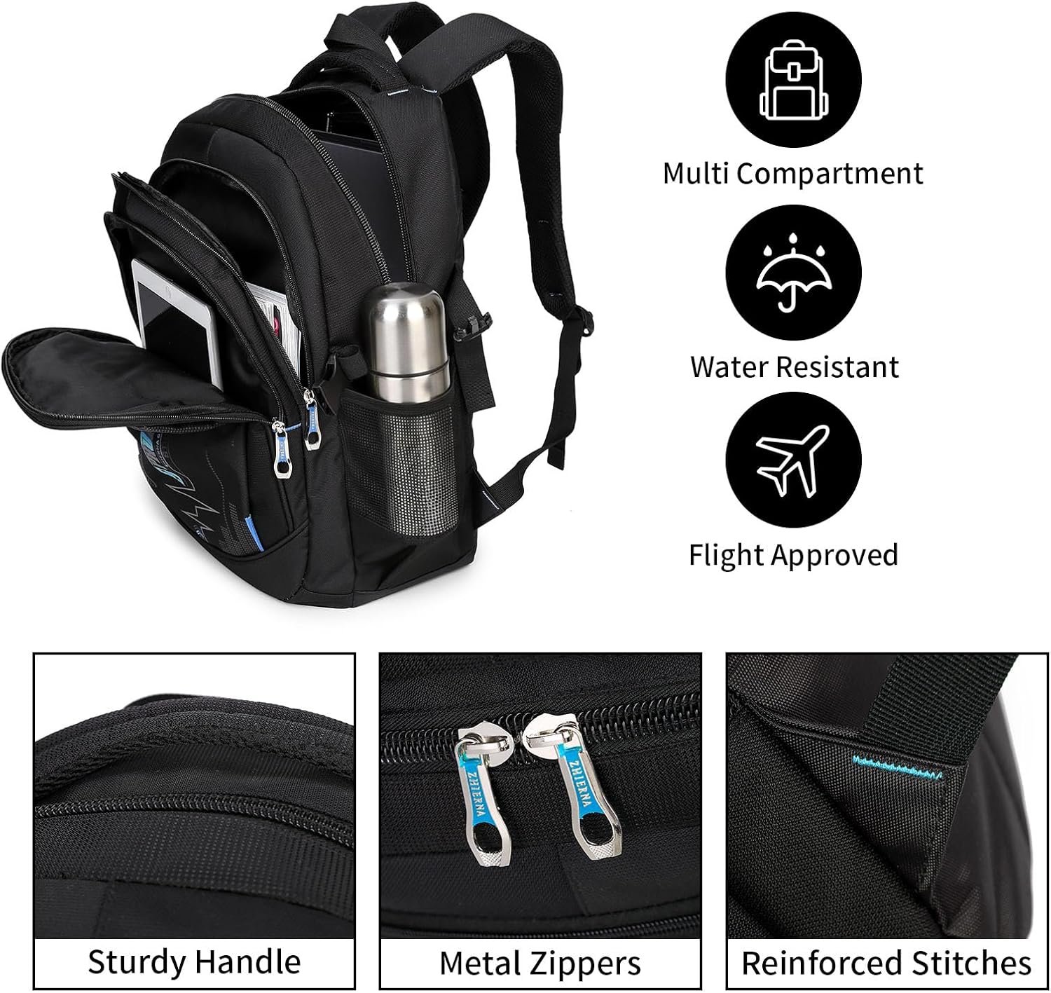 - Multifunktionelle Fächer: Die zahlreichen Fächer bieten genügend Platz für iPad, Powerbank, DIN A4-Ordner, Geldbörse usw. Ausserdem gibt es ein gepolstertes Fach für den Laptop, die seitliche Netztaschen sorgen für Regenschirm, Wasserflasche usw.