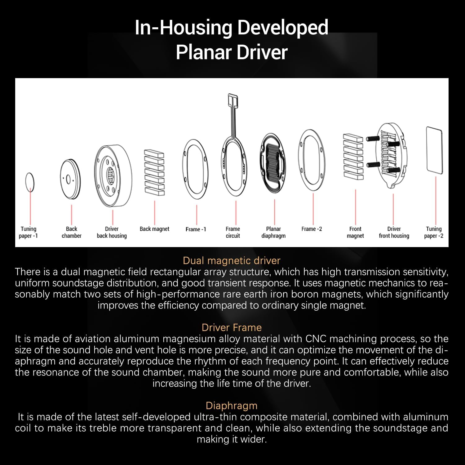 - DOPPELTER MAGNETTREIBER – Es gibt eine rechteckige Array-Struktur mit zwei Magnetfeldern, die eine hohe Übertragungsempfindlichkeit, eine gleichmässige Klangbühnenverteilung und ein gutes Einschwingverhalten aufweist. Es nutzt magnetische Mechanik,
