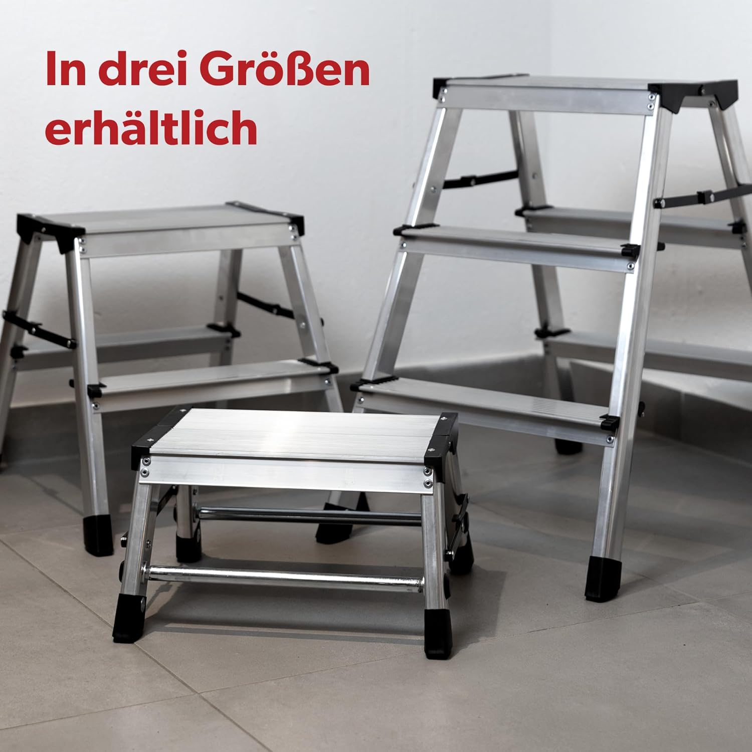 - PRODUKT DETAILS - Anzahl Stufen: 3 | Abmessungen (geöffnet): 40,2 x 61,6 x 57 cm | Abmessungen (zusammengefaltet): 40,2 x 19,9 x 64,8 cm | Gewicht: 2,46 kg | Stufenbreite: 20 cm | Material: Aluminium | Norm: DIN EN14183-B-2