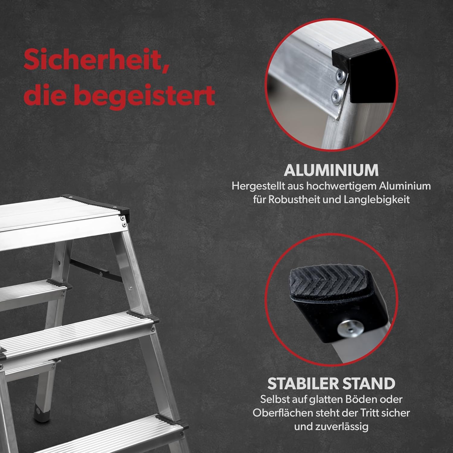 - SICHER & STABIL - Die Füsse des Klapptritts sind gummiert und sorgen damit, in Kombination mit den geriffelten Stufen, für einen sicheren Stand und ermöglichen den Einsatz auf unterschiedlichen Oberflächen