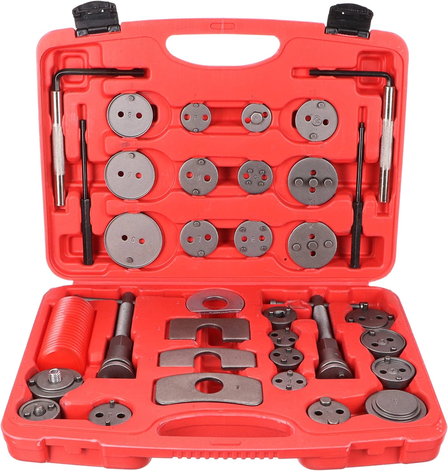- Kompletter Bremskolbenrücksteller Set BRAKE SET mit 35 Teilen in einem Kunststoffkoffer, geeignet für die Montage/Umkehrung von Scheibenbremskolben/Bremssätteln. Das Set enthält eine rechte und linke Spindel mit Magnet, vier Anschläge, zwei