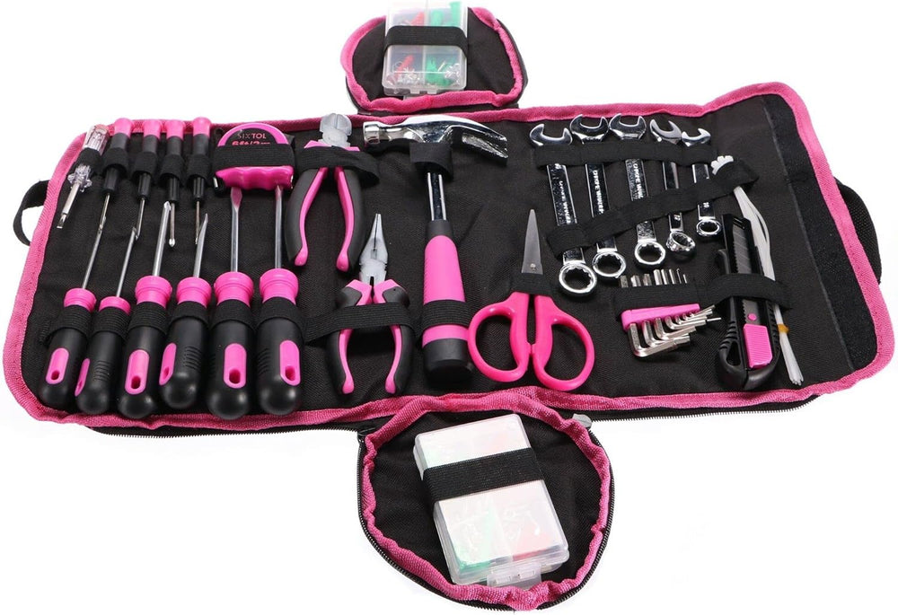 - Das SIXTOL HOME PINK 120 Werkzeugset enthält: 1x Klauenhammer, 1x Zange mit langen Backen, 1x Seitenspaltzange, 1x Schere, 1x Brechmesser, 10x Schraubendreher, 1x Spannungsprüfer, 8x Innensechskantschlüssel, 5x Ringmaulschlüssel CrV: 10, 12, 13, 14,
