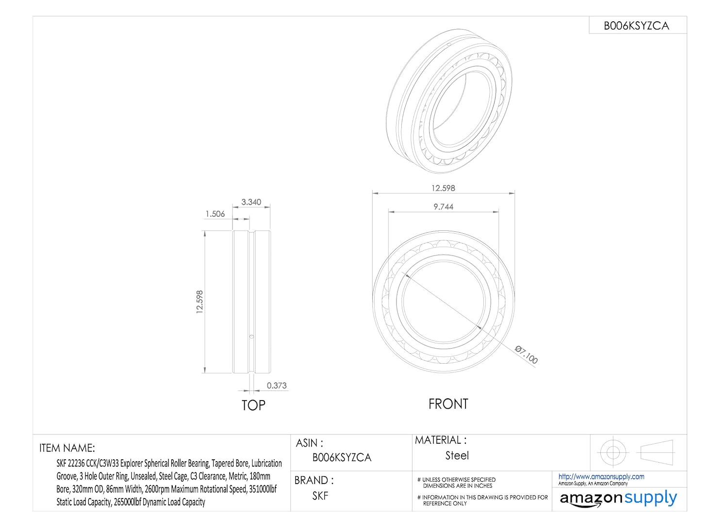 - Bohrung/Innendurchmesser: 180.000; Korpus Aussendurchmesser: 320.000; Breite/Dicke: 86.000; Toleranzgruppe: Klasse 5 (P5); Radialer Innenraum/Vorlastgruppe: C3
