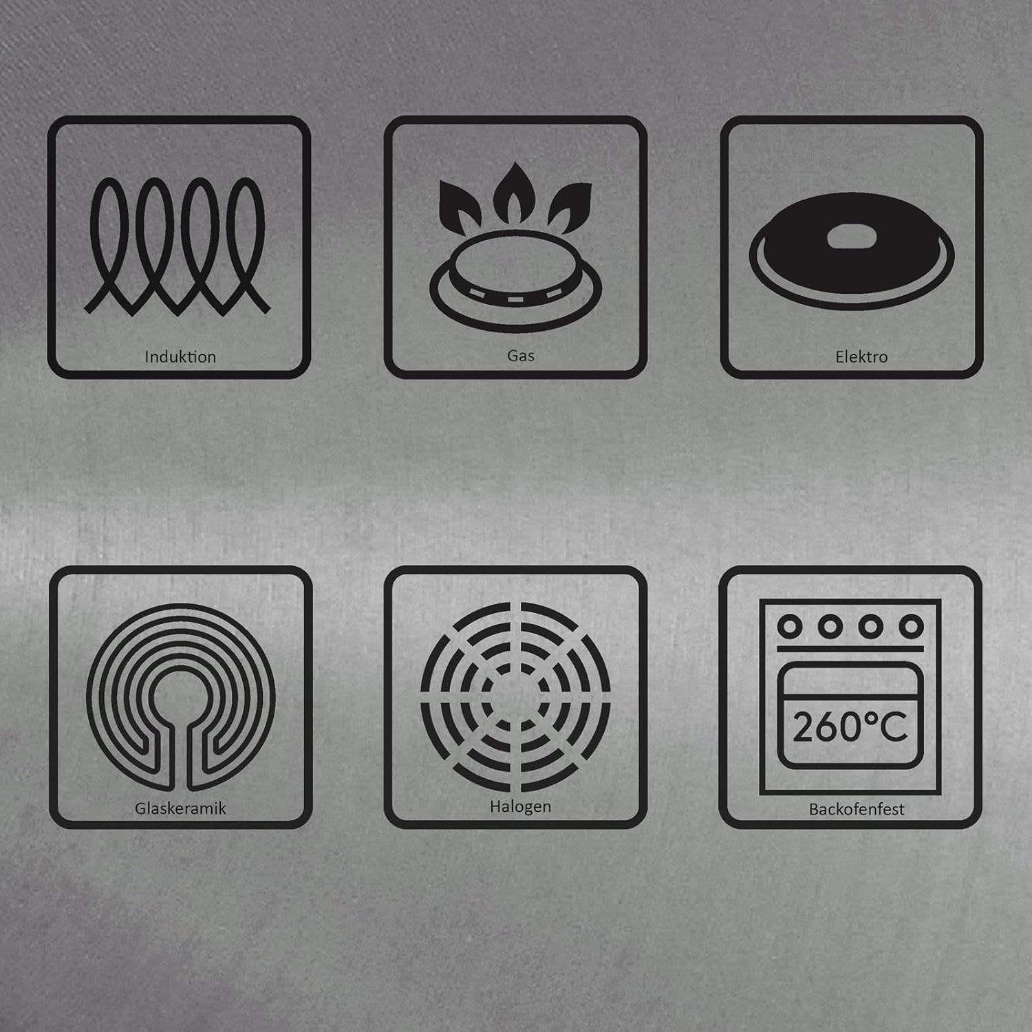 - Der 12 cm hohe Brattopf aus wertigem Edelstahl ist bis zu 260° C backofenfest & spülmaschinengeeignet, dank des 3-Schicht-Bodens im Topf wird die Wärme von der Kochzone besser in diesen Topf geleitet