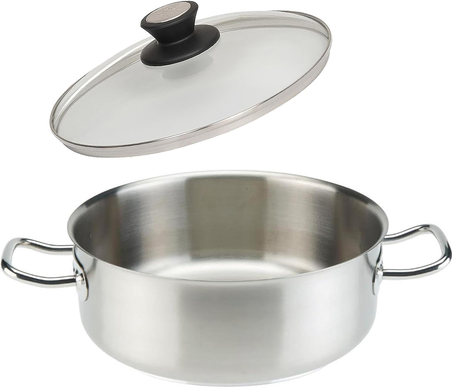 - Der Bratentopf mit Deckel Ø 28 cm besteht aus strapazierbarem 18/10 Edelstahl und verfügt über einen Sandwichboden (Edelstahl-Aluminium-Edelstahl) sowie über handgeschweisste & verstärkte Griffe