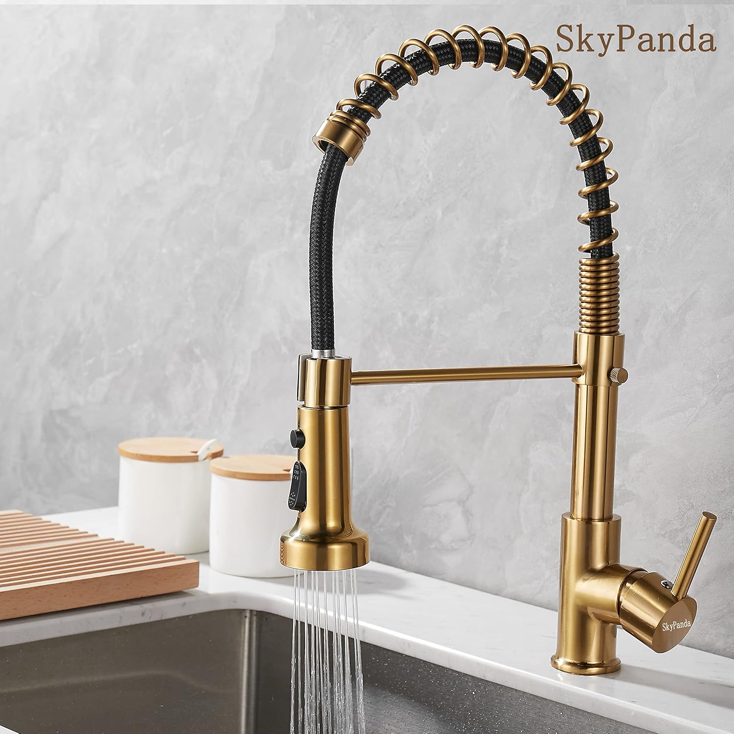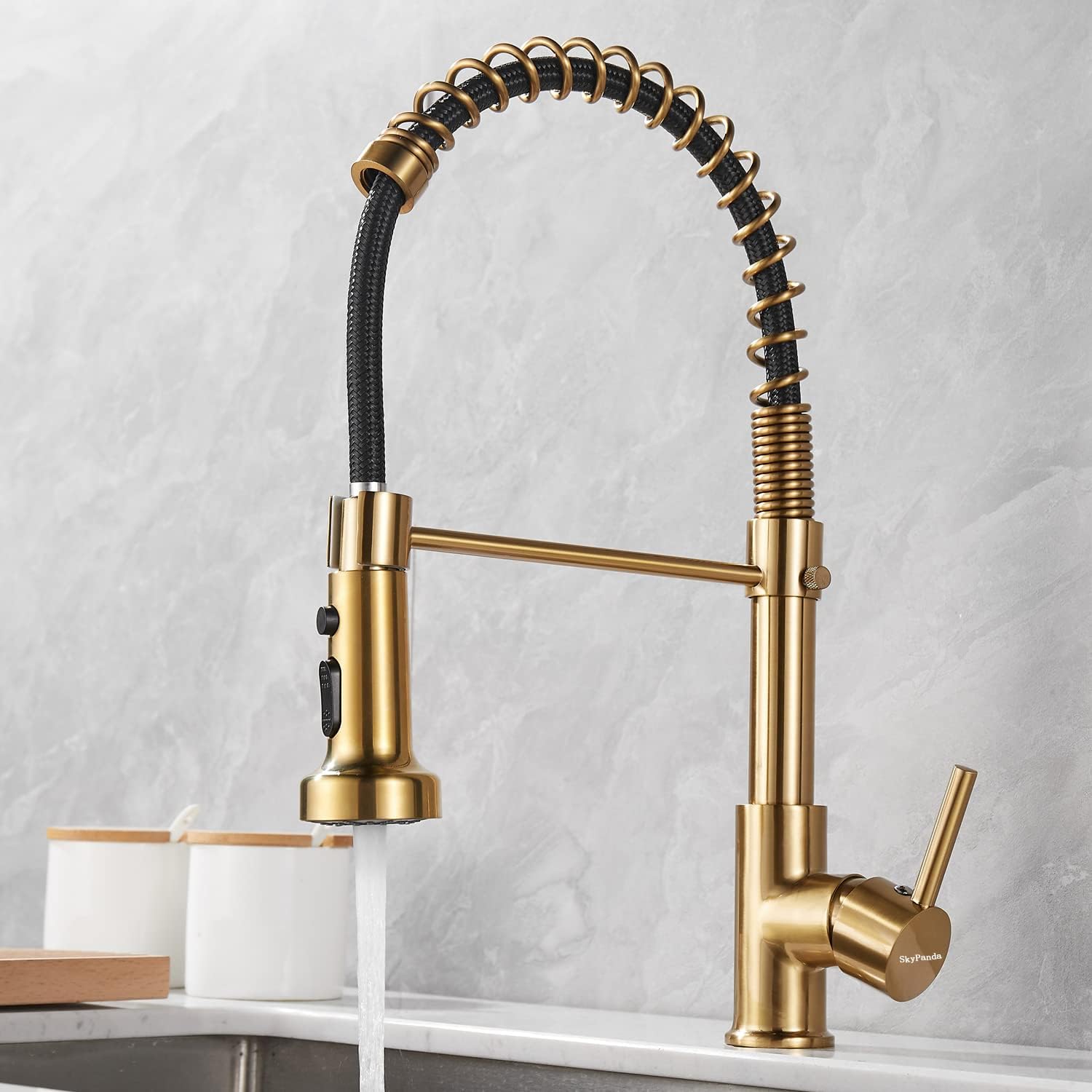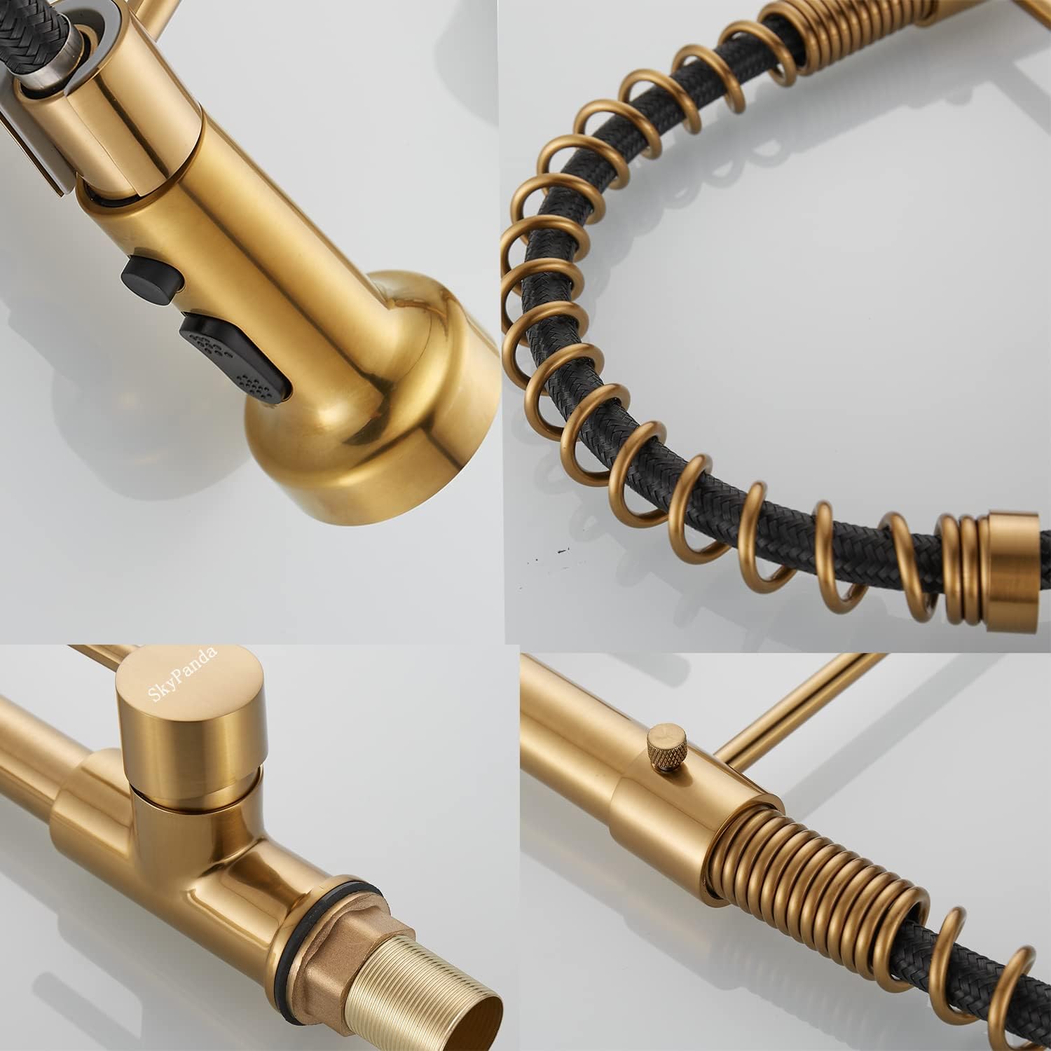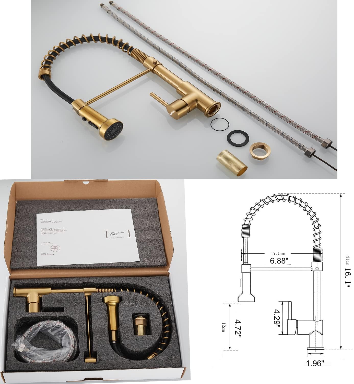- ✅. Gold gebürsteter Küchenarmatur mit herunterziehbarem Sprüher. Küchenarmatur mit hohem Lichtbogenfederdesign, aus massivem Messing mit goldgebürstetem Nickel-Finish. Beständig gegen alltägliche Korrosion, leicht zu reinigen, staubdicht, lange