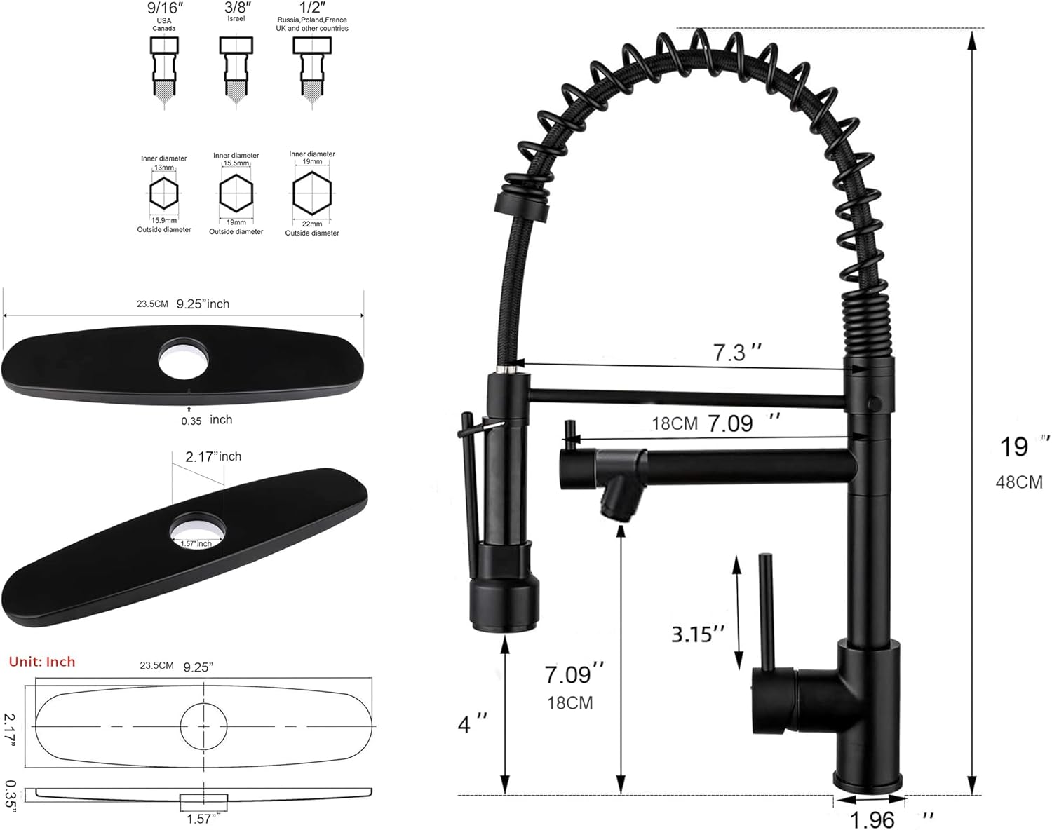• ✅. Gesamthöhe: 48 cm (19"), Höhe eines Auslaufs: 10 cm (4"), Höhe eines anderen Auslaufs: 18 cm (7,09"); 3/8" H&C-Wasserschlauch und Installationszubehör sind im Lieferumfang enthalten; 23,5 cm (9,25") platte inklusive, Plattenbreite beträgt 5,5