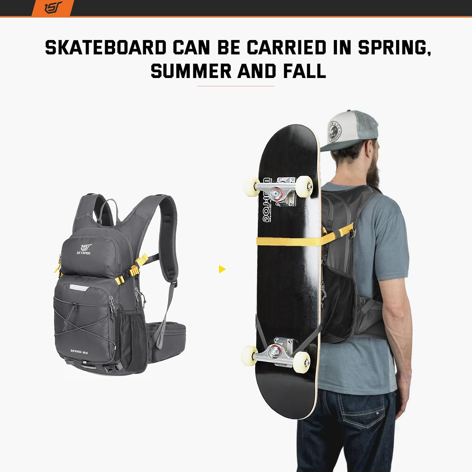 - Rad- & Skifahren: Der Platz vor dem Rucksack kann durch die Knöpfe auf beiden Seiten eingestellt werden, mit denen der Reithelm befestigt werden kann; Gleichzeitig kann es verwendet werden, um das Skateboard oder Snowboard zu befestigen, indem die