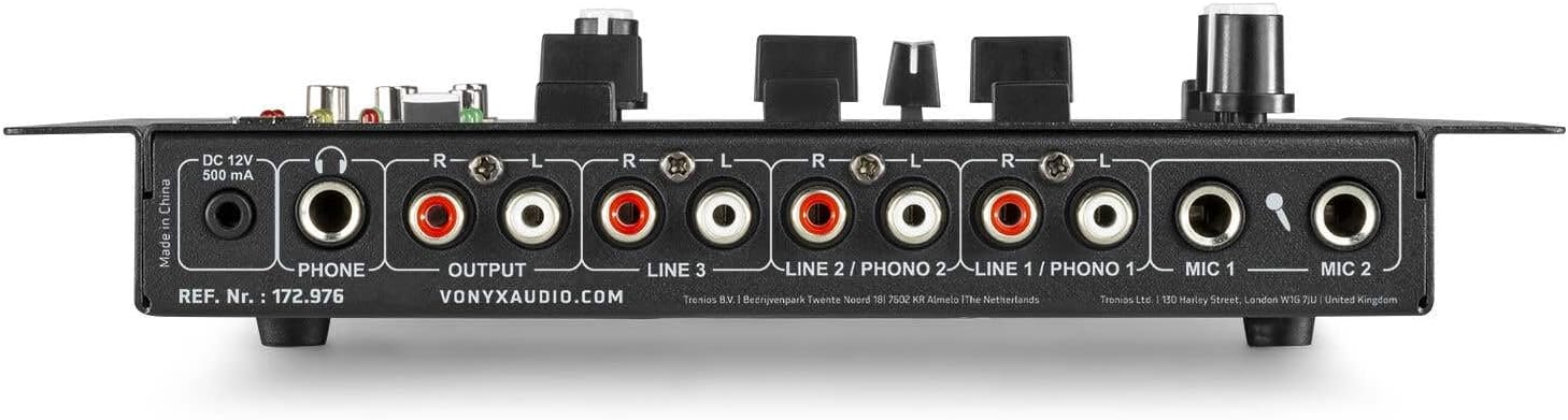 - Anschlüsse: Das Mischpult ist mit mehreren RCA-(Cinch)-Eingängen und -Ausgängen ausgestattet. Das Mischpult verfügt ausserdem über mehrere 6,3-mm-Klinkenbuchsen, an die Sie Mikrofone und Kopfhörer anschliessen können.