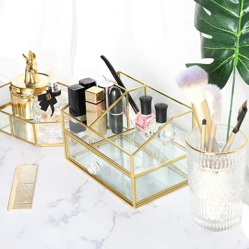• 【Design & Materialien】 - Makeup Organizer Gut gemacht mit Premium-Gold-Messing-Trim und glattem Glas. High-End-Textur-Stil ist, um Ihre Kommode Lebensqualität und grosse Helfer für Desktop-Organisation hinzuzufügen.