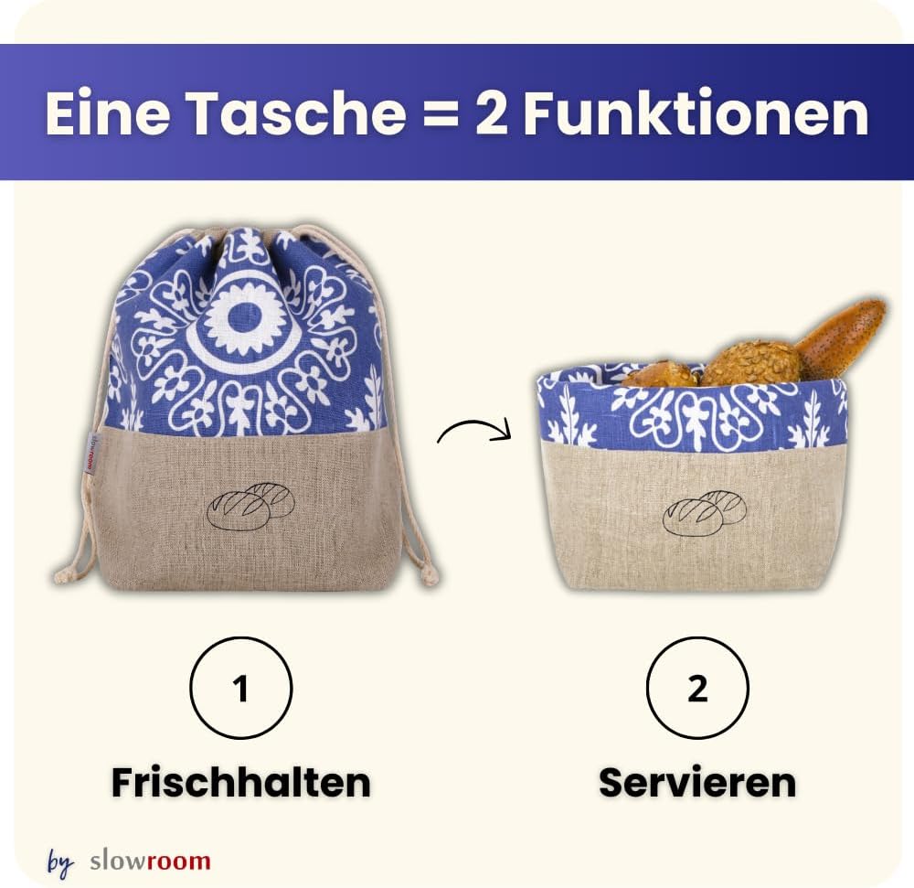 - 2 in 1 - Der Brotsack kann sowohl als Brottasche als auch als Brotkorb verwendet werden. Verwenden Sie den Behälter als Brottasche, um Ihr Brot frisch und knusprig zu halten. Klappen Sie einfach den oberen Rand nach innen und Sie erhalten einen