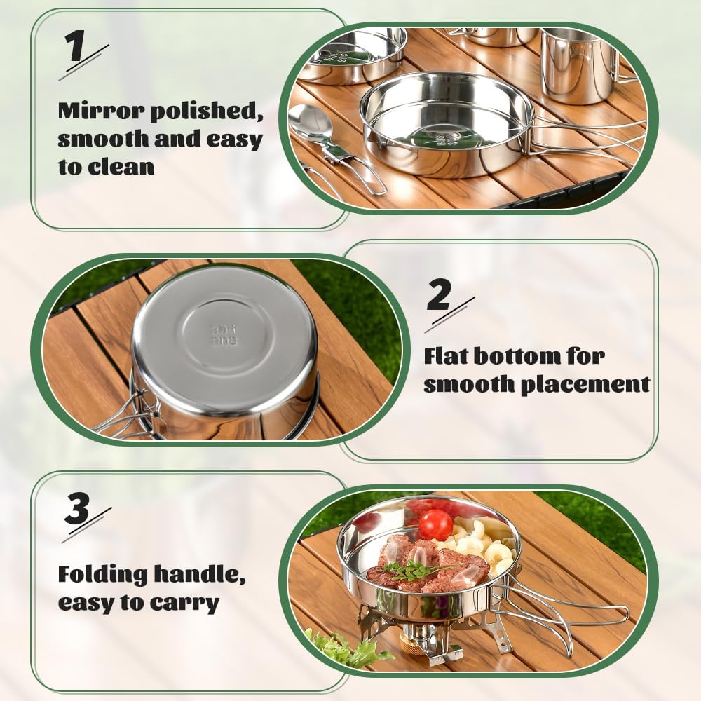 - ✅[Camping Kochgeschirr Set] Outdoor Kochgeschirr Picknick Topf Set Aus lebensmittelechtem Edelstahl, um die Gesundheit zu gewährleisten. Rostfrei, korrosionsbeständig, hohe Temperaturbeständigkeit: 800 ℃, gleichmässige Wärmeleitung, wodurch die