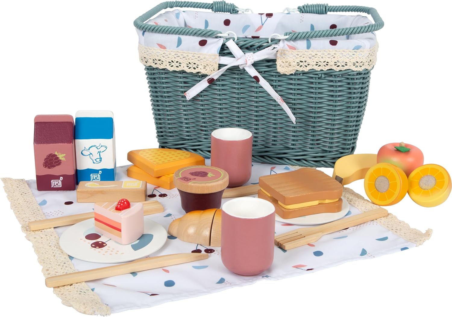 - Das Körbchen aus Korbgefecht, die Gedecke für 2 Personen, das Picknick-Zubehör und die Spiellebensmittel aus Holz sind robust und liebevoll gestaltet