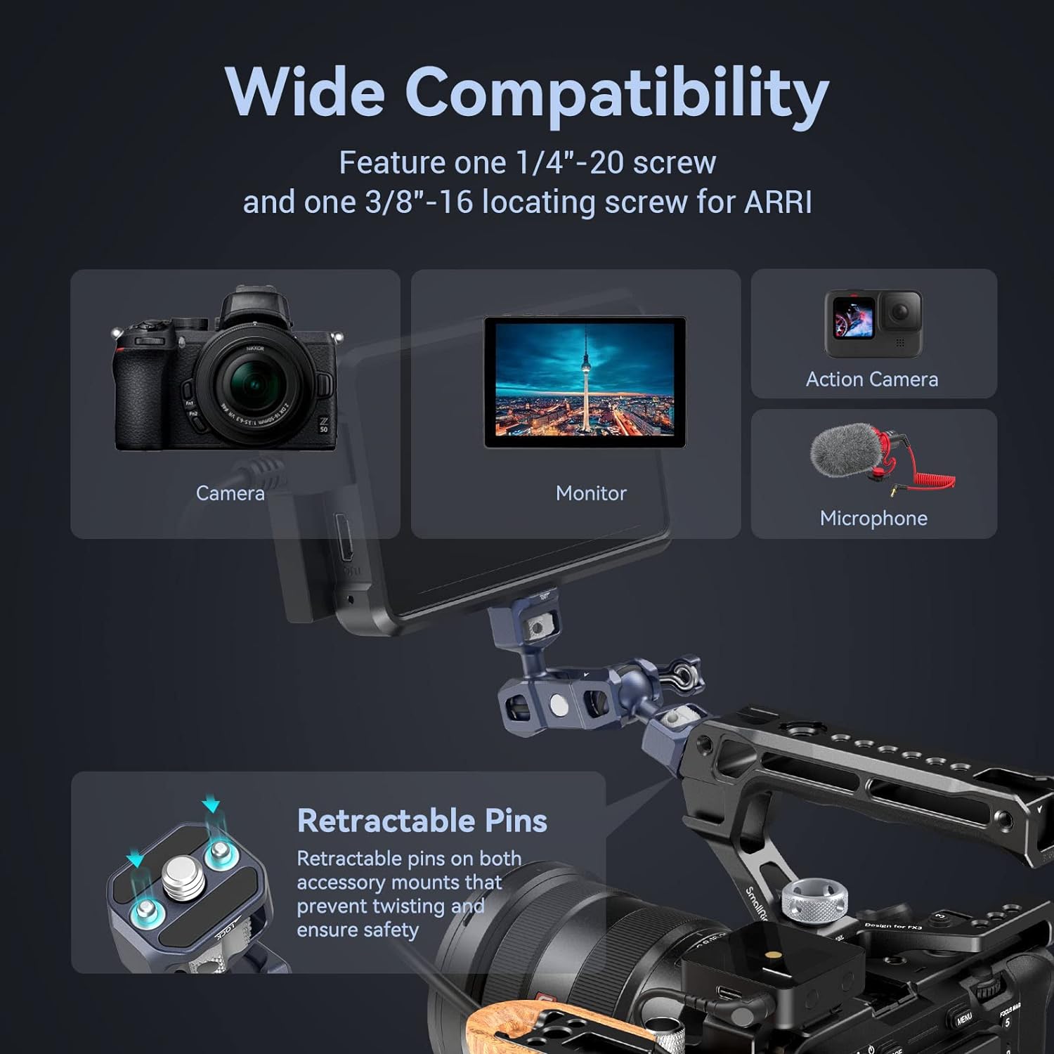 - Einziehbare Stifte mit Verdrehschutz: Beide Enden verfügen über einziehbare Stifte, um ein Verdrehen zu verhindern. Sie können es am Zubehör mit 1/4" und 3/8"-16 Gewindelöchern (mit oder ohne Positionierungslöchern) montieren, sehr fest und ohne