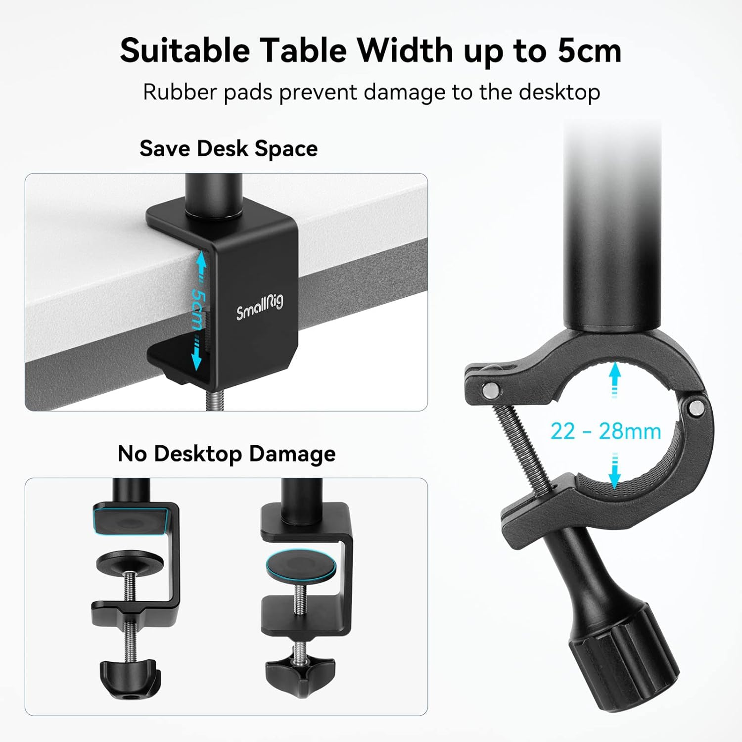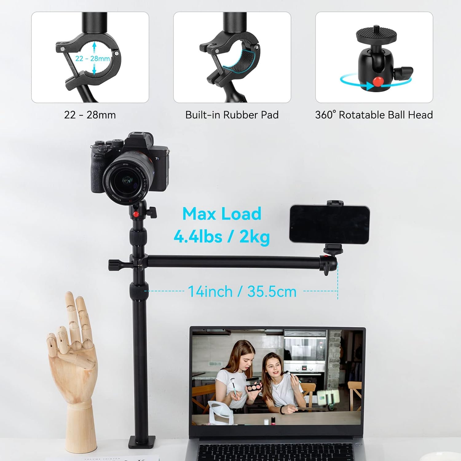 - Zwei-in-Eins-Tischhalterung: Die ausziehbare Tischhalterung ist mit einem 1/4-Zoll-Kugelkopf und einem Adapter für Ringlicht ausgestattet, was eine perfekte Wahl für die Unterstützung von Ringlicht, DSLR-Kamera, Smartphone, Panel-Licht usw. ist. Es