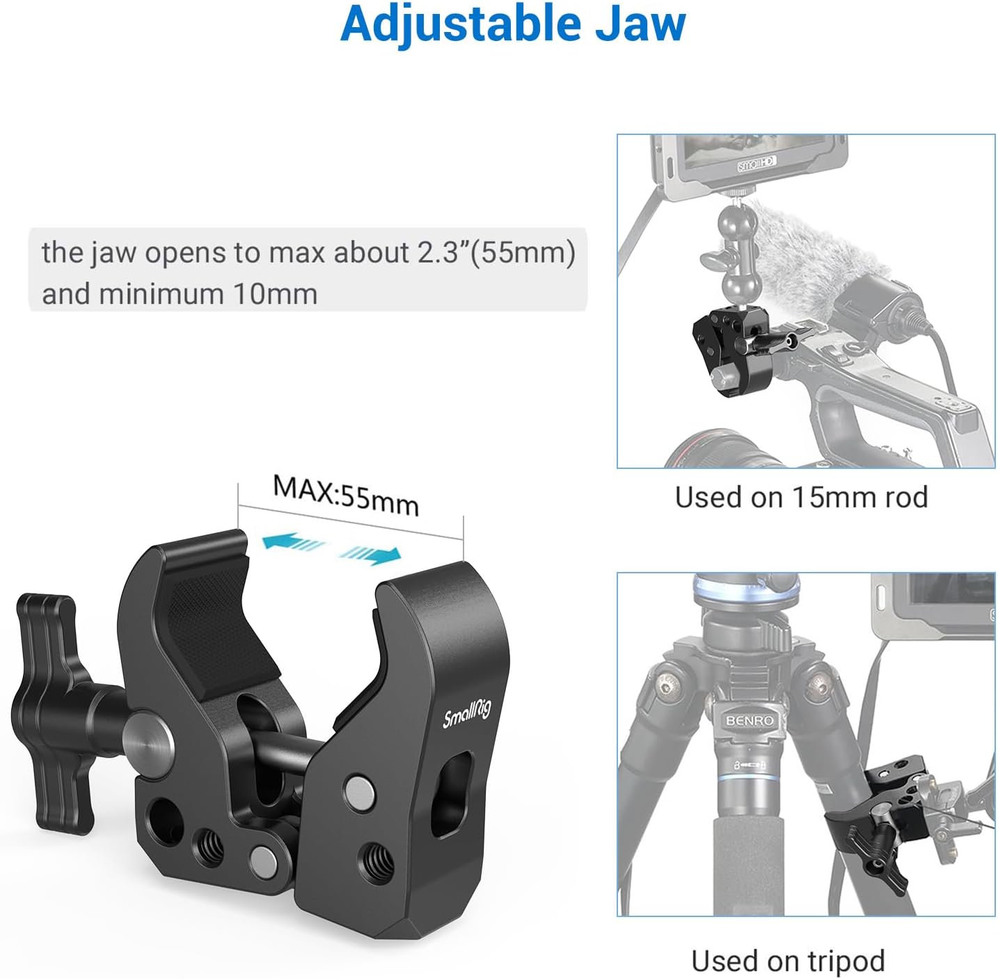 - 【Offen für 55 mm】 SMALLRIG Super Clamp 2220 ist eine Klemme mit Backen, die von 10 mm bis 55 mm geöffnet sind. Es kann an Kameras, Lichtern, Regenschirmen, Haken, Regalen, Glasplatten, Querstangen, Kardanstabilisatoren, Video-C-Ständern und sogar