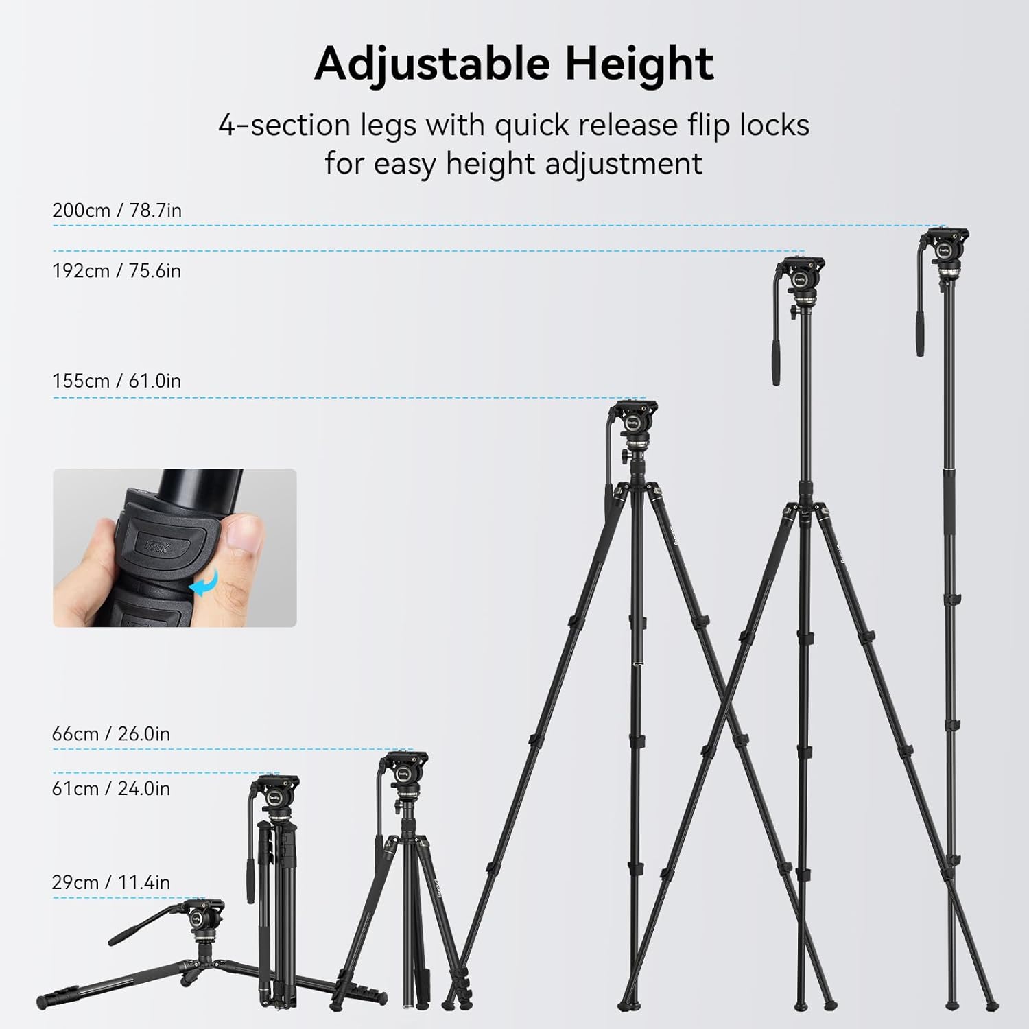 - Professioneller Fluidkopf: Der Stativkopf ermöglicht einfache Montage ohne Ausrichtung und bietet stabile Aufnahmen aus verschiedenen Winkeln (90°/-65° Neigung und 360° Drehung). Mit der integrierten Nivellierbasis können Sie die Neigung schnell