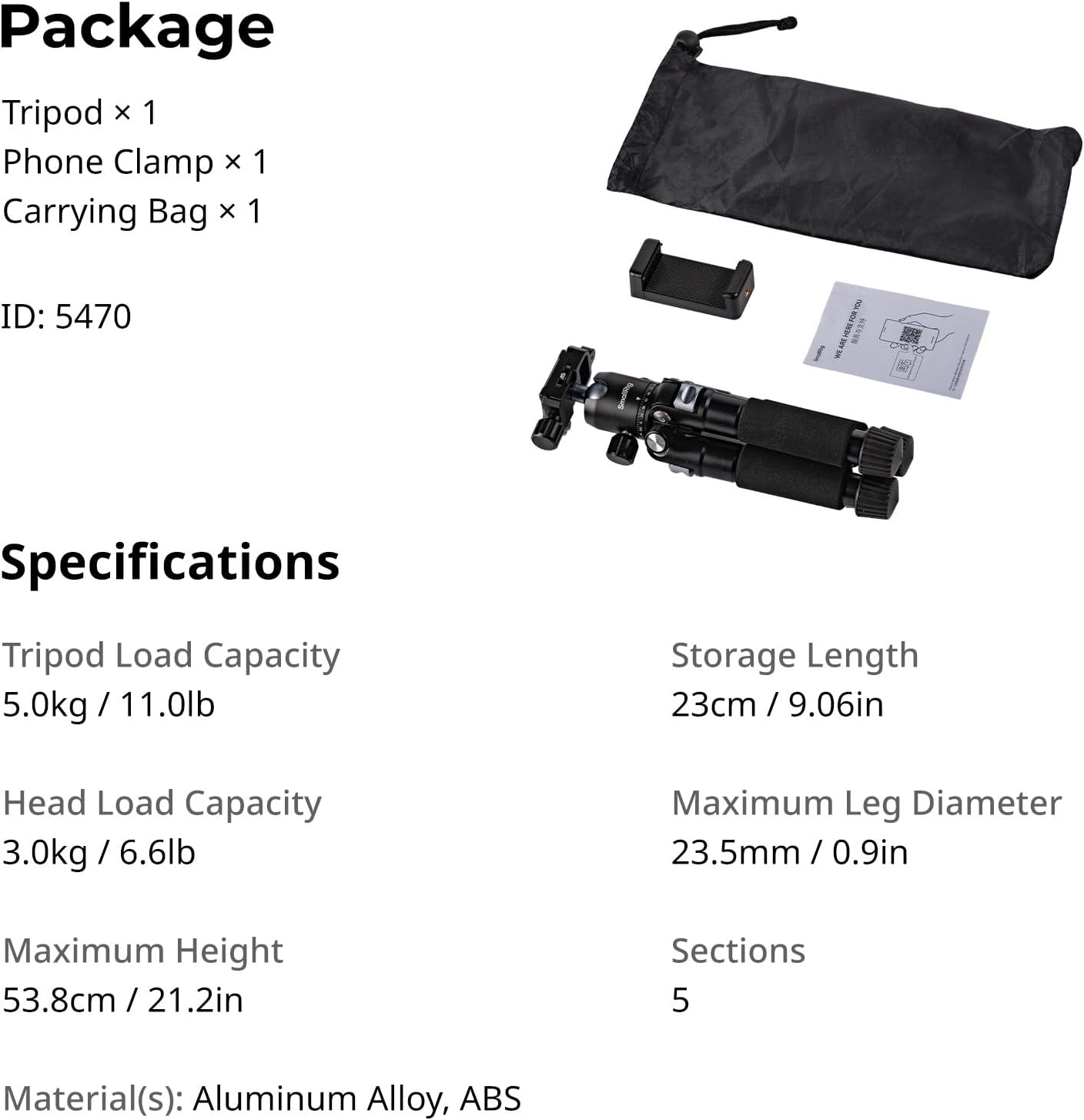 • 53,8 cm / 21,2 Zoll Tischstativ: Das VT-20Pro-Stativ erreicht eine Arbeitshöhe von 53,8 cm / 21,2 Zoll und bietet Platz für verschiedene Aufnahmeperspektiven. Die Stativbeine aus Aluminiumlegierung unterstützen eine Nutzlast von 5 kg (3 kg für den