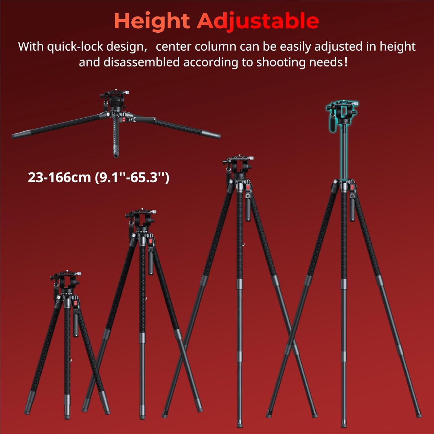 - Niedrige Winkelaufnahmen & Höhenverstellung: Die Mittelsäule verfügt über ein Schnellverschluss-Design für einfache Höhenverstellungen und kann entfernt werden, um bei einer Mindesthöhe von 23 cm (9,1'') in niedrigen Winkeln zu fotografieren. Die