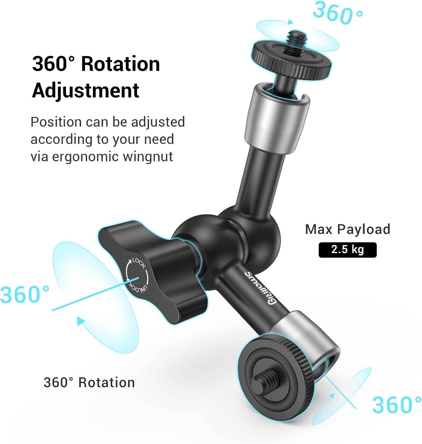 - 1/4" Schraube an jedem Ende zum Anschliessen von Blitzlichtern, Mikrofon, LCD-Monitor, Mikrofon oder Action-Kamera an der Kamera. Mit dem um 360° drehbaren Kugelkopf können Sie die Winkel frei einstellen
