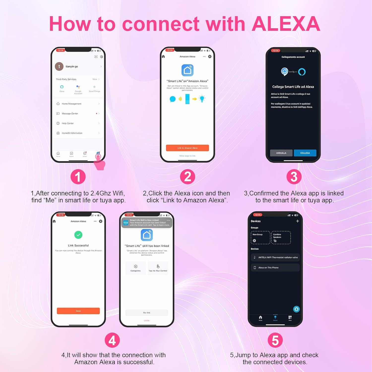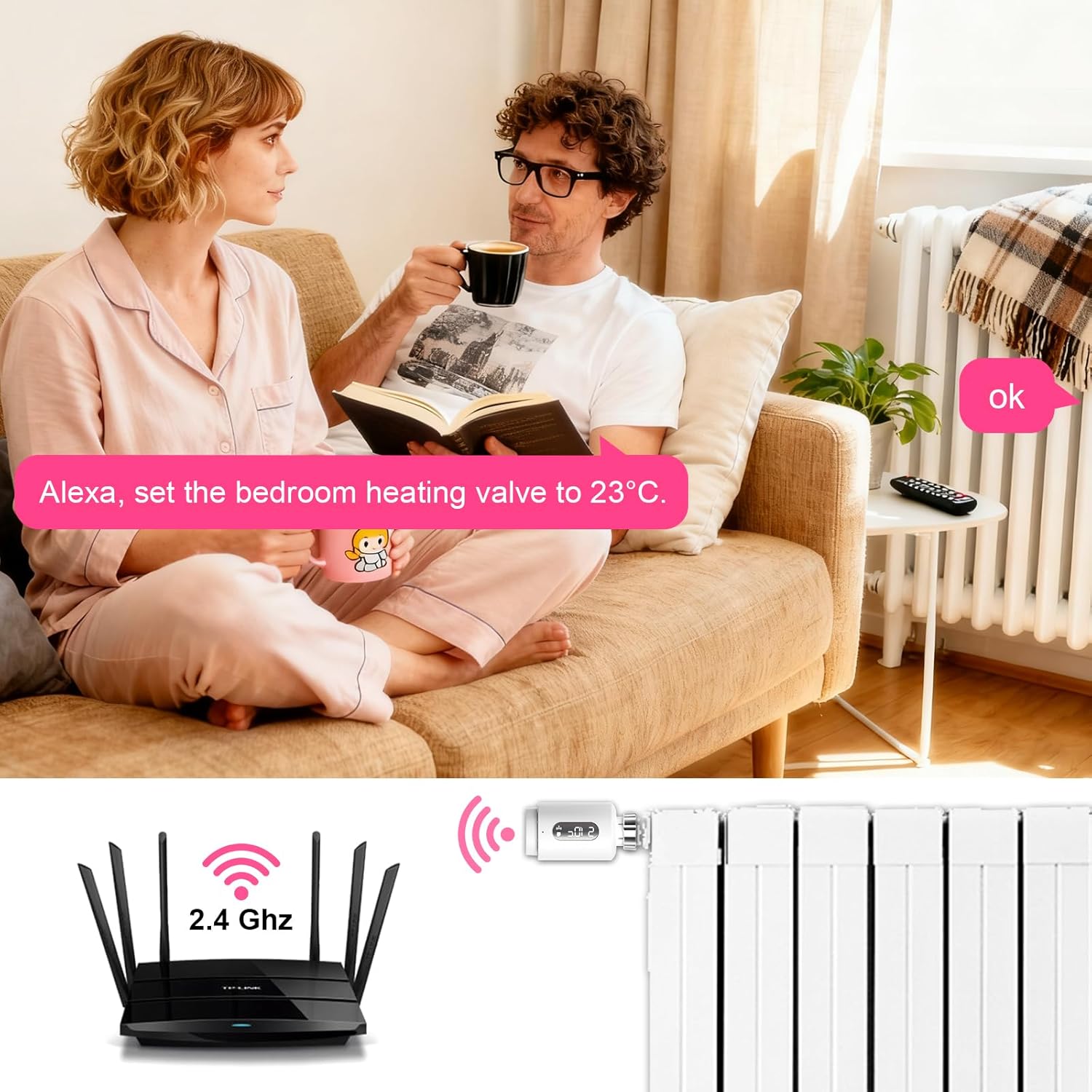 - APP Fernbedienung und Sprachsteuerung : Sie können Smart Life oder TUYA Smart APP herunterladen, dann verbinden Sie die Smart Heizkörperthermostat. (Unterstützt nur 2,4GHz-WLAN) Mit der App können Sie sich mit Alexa verbinden und das Heizungsventil