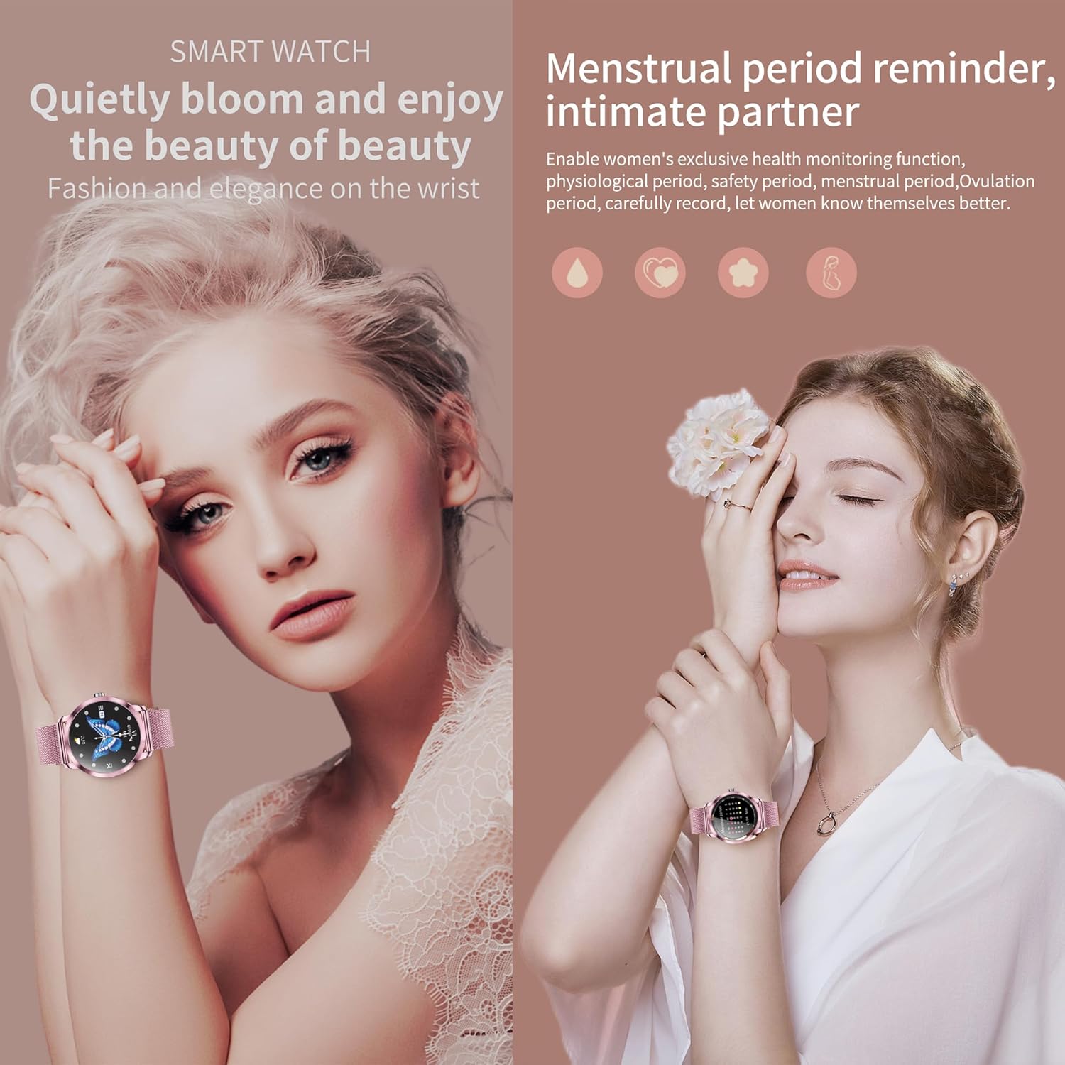 - ⌚【Bluetooth-Smartwatch für Frauen】 Nach erfolgreicher Verbindung mit Dual-Bluetooth können Sie mit Ihrer schönen Smartwatch Anrufe tätigen und empfangen.Sie können Benachrichtigungen empfangen und Social-Media-Nachrichten von SMS und SNS