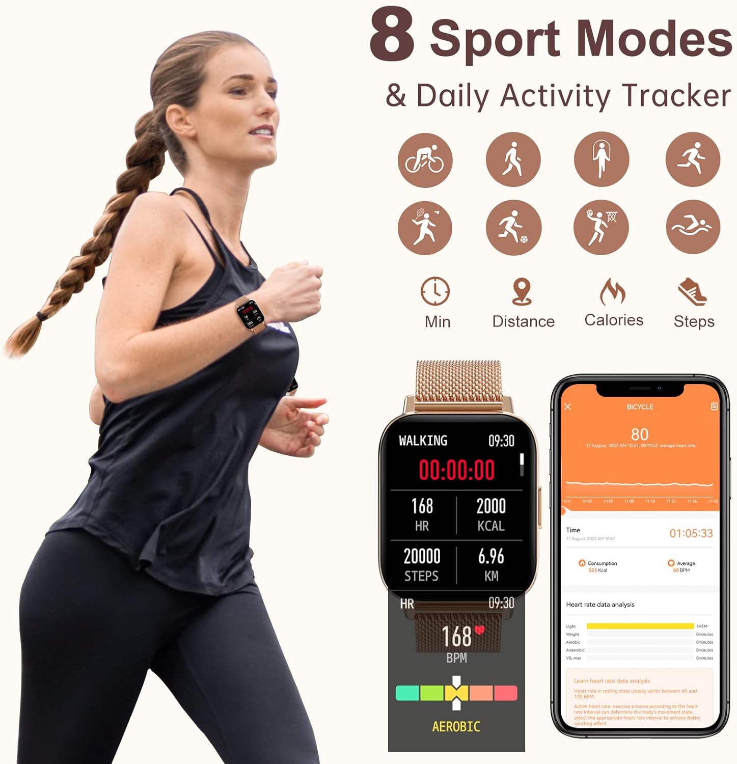 - Fitnessuhr und 8 Sportmodi: Der Fitness-Tracker zeichnet Ihre Aktivitäten den ganzen Tag über wie Schritte, Kalorien und Distanz genau auf. Die Fitnessuhr für Damen unterstützt 8 Sportmodi (Gehen, Laufen, Radfahren, Schwimmen, Seilspringen, Fussball,