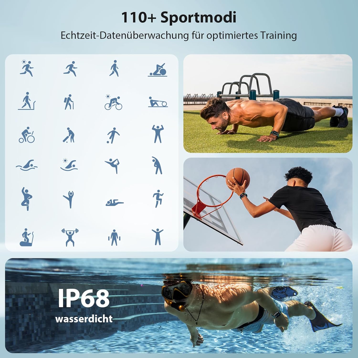 • 110 Sportmodi & IP68 wasserdicht Sportuhr: Diese Fitnessuhr für Damen Herren unterstützt 100 Sportmodi wie Laufen, Radfahren, Schwimmen, Fussball usw. Es zeichnet verschiedene Daten präzise auf, um Ihnen dabei zu helfen, wissenschaftlich zu