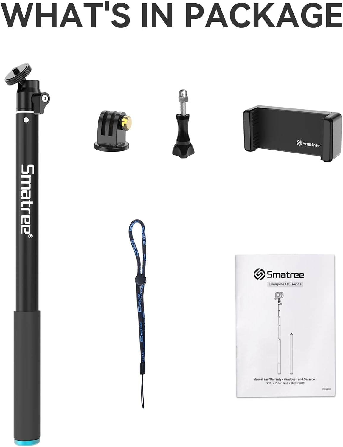 - Packliste: 1 x Ausziehbare Stange, 1 x Stativhalterungsadapter, 1 x Schwarze Daumenschraube, 1 x Verstellbare Handschlaufe, 1 x Telefonhalterung, 1 x Bedienungsanleitung