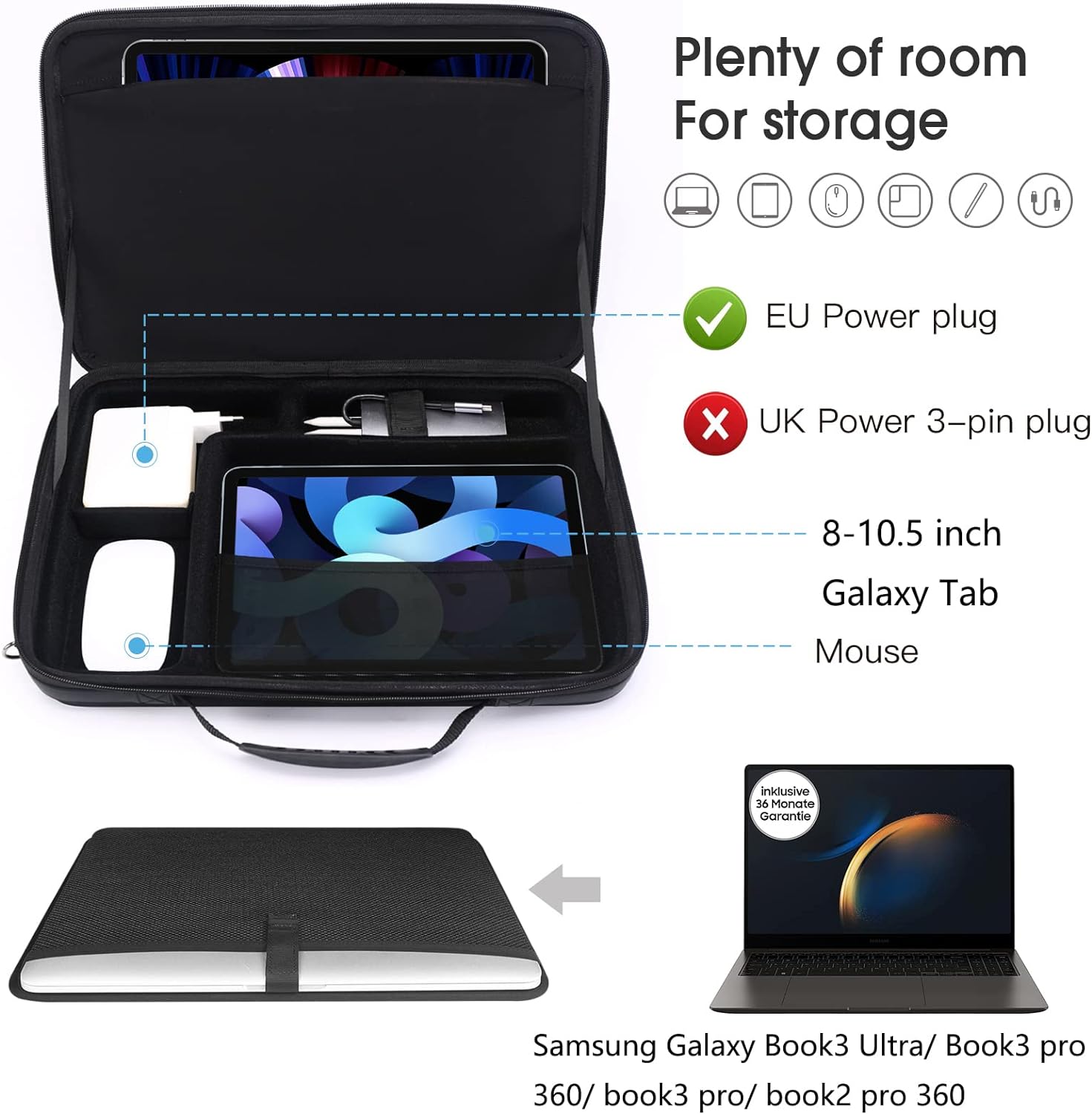 - KOMPATIBILITÄT: Diese Hartschalen hülle ist für das Samsung Galaxy Book3 Pro 16 zoll. Die obere Abdeckung hat eine Tasche, die ein 10-12,9-Zoll-Tablet aufnehmen kann. Die Innenmasse der Laptoptasche: 37 cm x 25,5 cm x 2 cm.