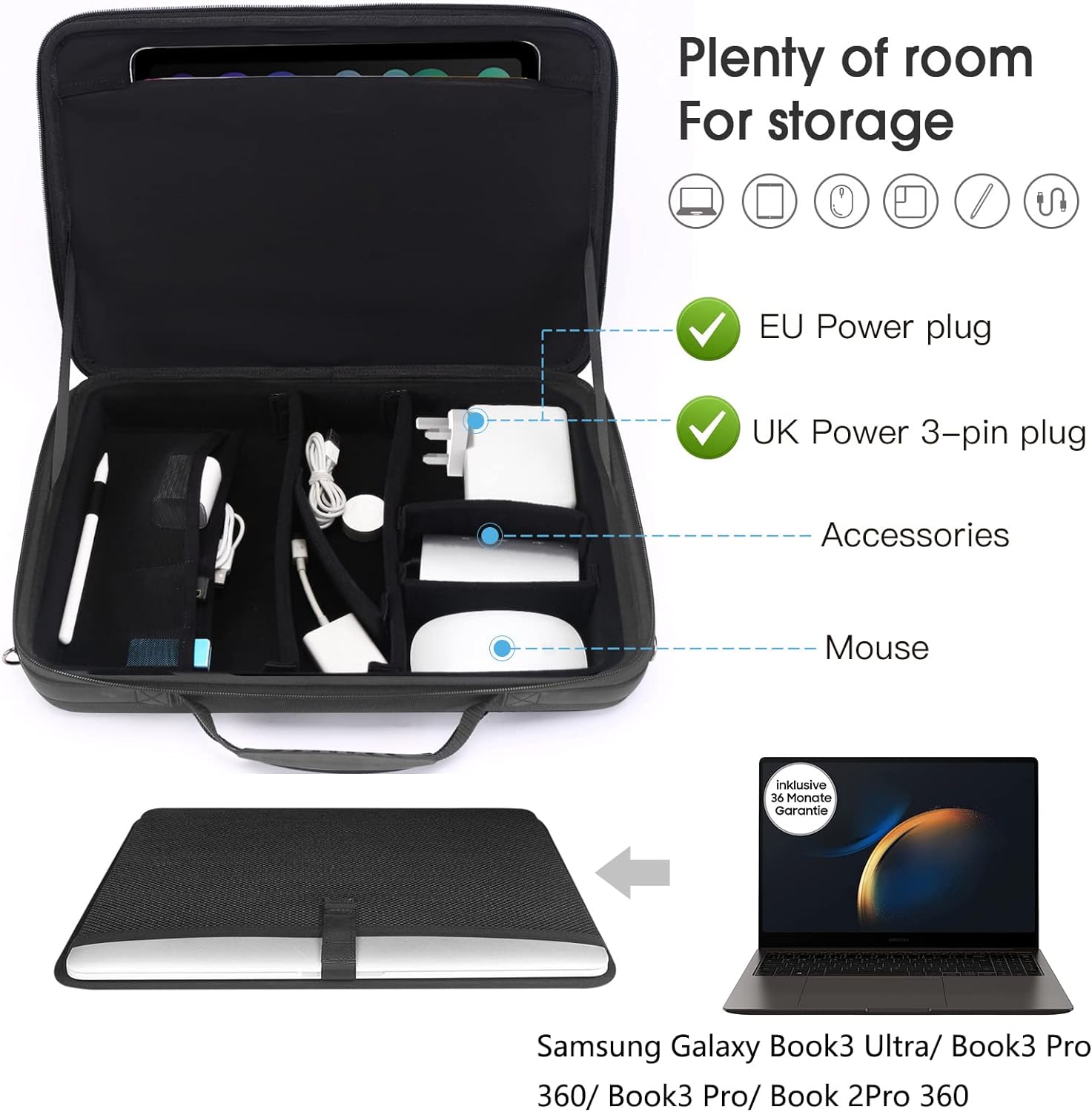 • KOMPATIBILITÄT: Diese Hartschalen hülle ist für das Samsung Galaxy Book3 Ultra 16". Die obere Abdeckung hat eine Tasche, die ein 10-12,9-Zoll-Tablet aufnehmen kann. Die Innenmasse der Laptoptasche: 37 cm x 25 cm x 2 cm.