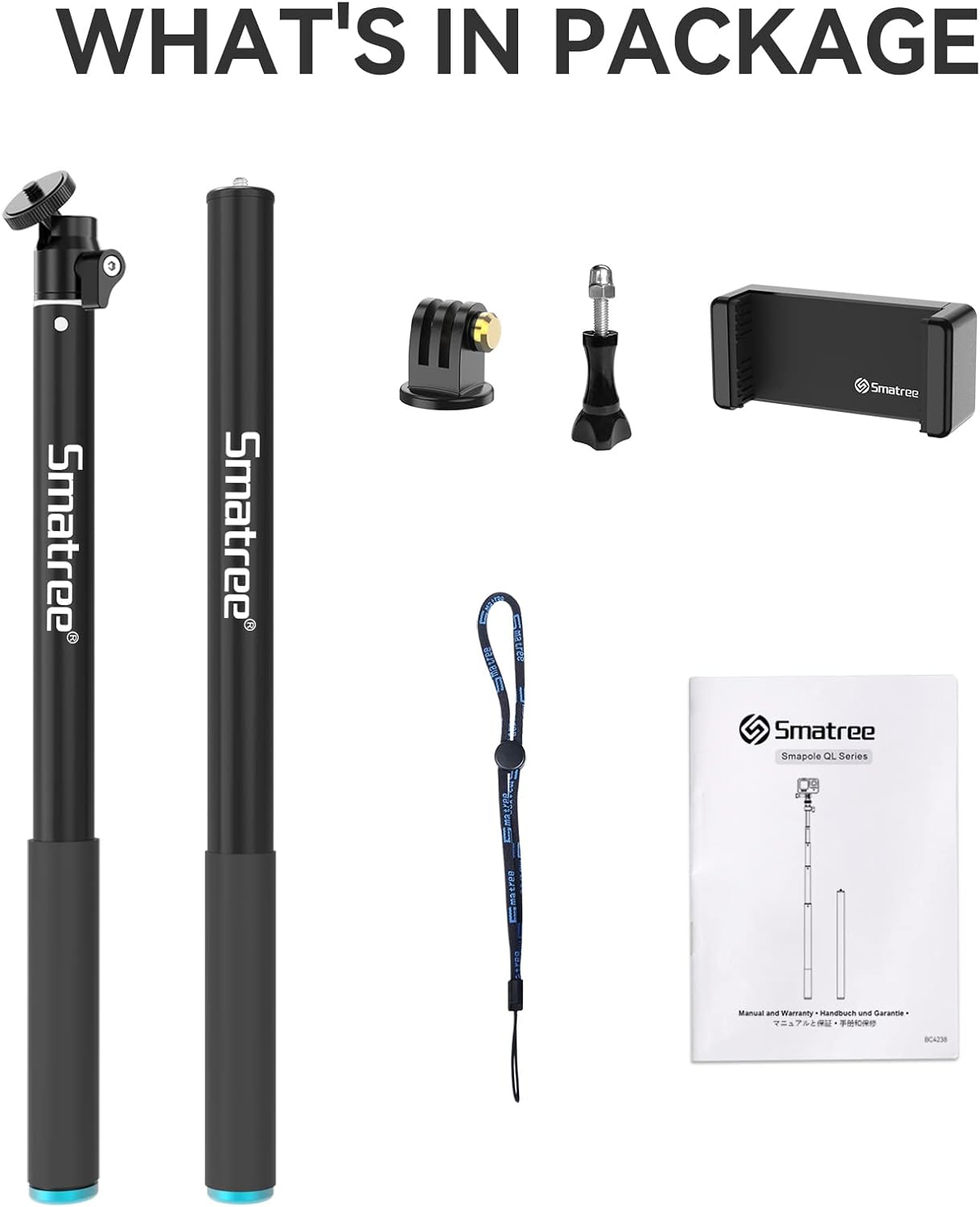 - Packliste: 1 x ausziehbare Stange, 1 x Schwimmstange, 1 x Stativhalterungsadapter, 1 x schwarze Rändelschraube, 1 x verstellbare Handschlaufe, 1 x Telefonhalter, 1 x Benutzerhandbuch