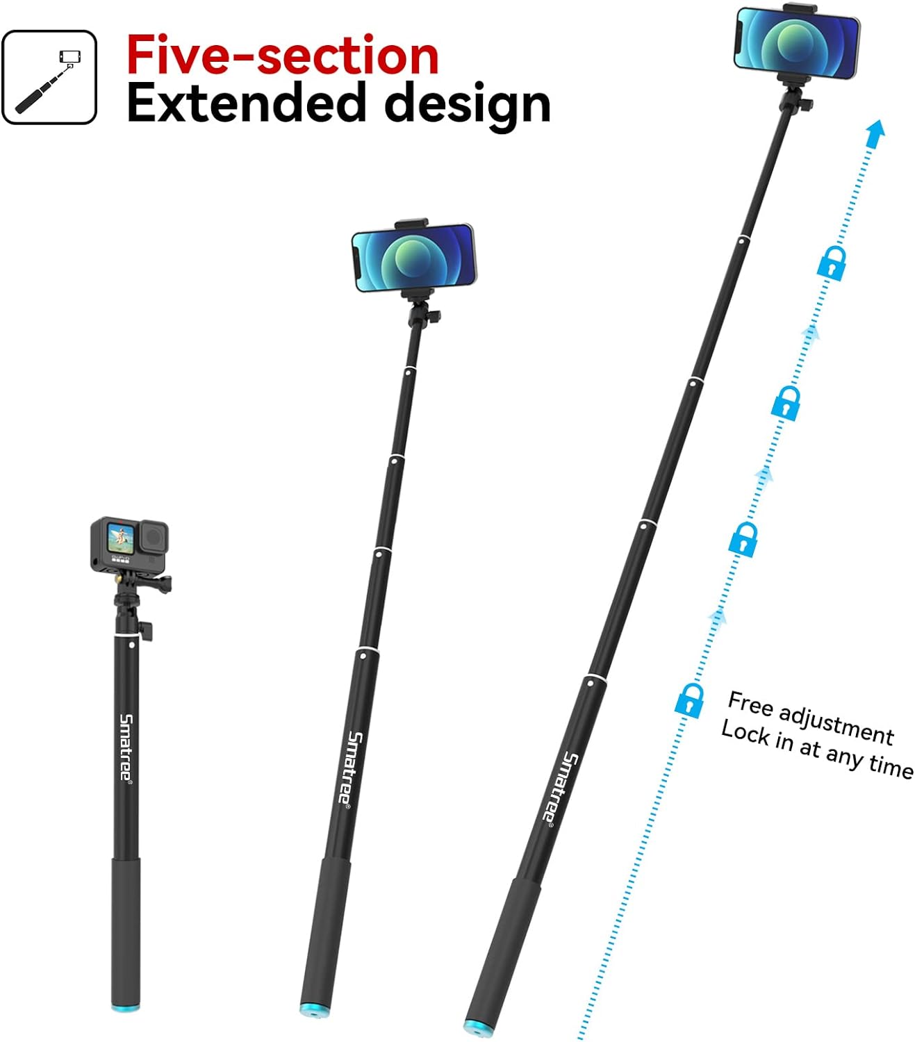 - Einstellbare Länge: Der Selfie-Stick besteht aus einer Teleskopstange (16,9"-70") und einem schwebenden Stick (16,9"). Der kürzeste ist 16,9 Zoll und der längste kann 86,9 Zoll betragen.