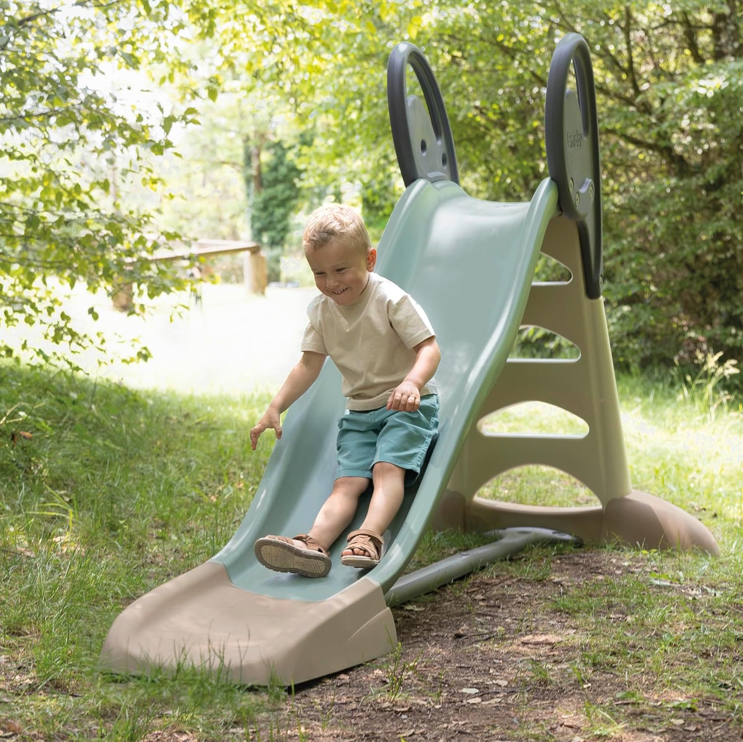- Anteil von 31% recyceltem Plastik – Die freistehende Riesenrutsche sorgt mit ihrer Doppelwelle für abwechslungsreichen & nachhaltigen Rutschspass. Der grosse Rutschauslauf sorgt für weiche und sichere Landungen