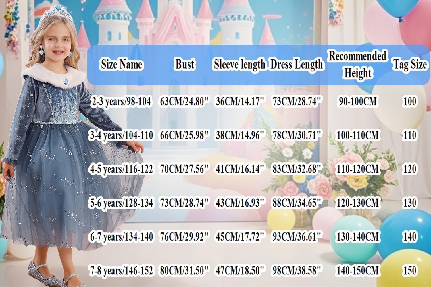 • 【Grösse】Dieses Eisprinzessin Kleider ist für Mädchen im Alter von 2-8 Jahren (98-152)geeignet. Wählen Sie die richtige Grösse entsprechend der Grösse und Körperform Ihres kleinen Mädchens. Das zarte blaue Prinzessinnenkleid und viele