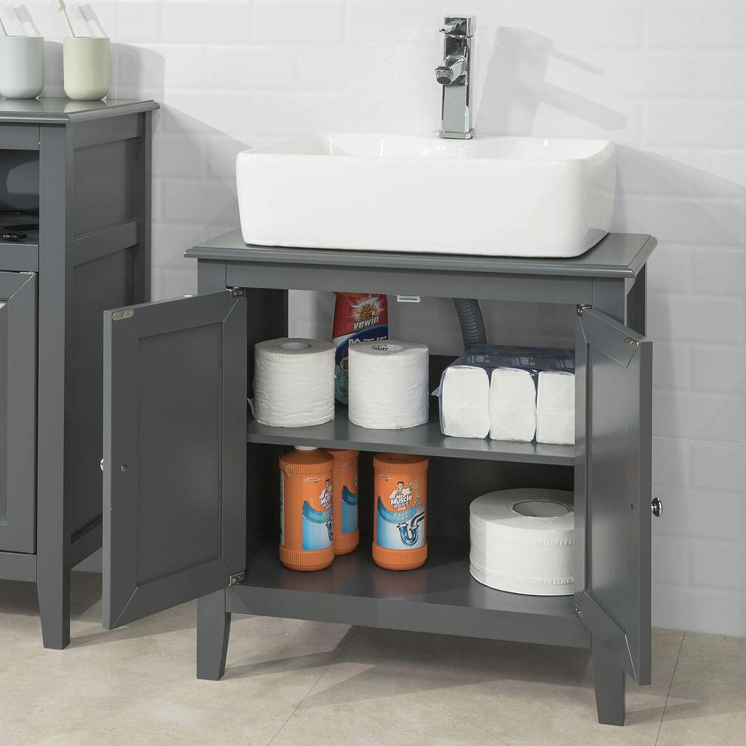 • 2 Türen und 2 Ablage bieten viel Stauraum: In dem Unterschrank können Sie alle Badezimmerpflege wie Reinigungsmittel, Waschmittel, WC - Reiniger oder andere Kleinigkeiten darin stellen.