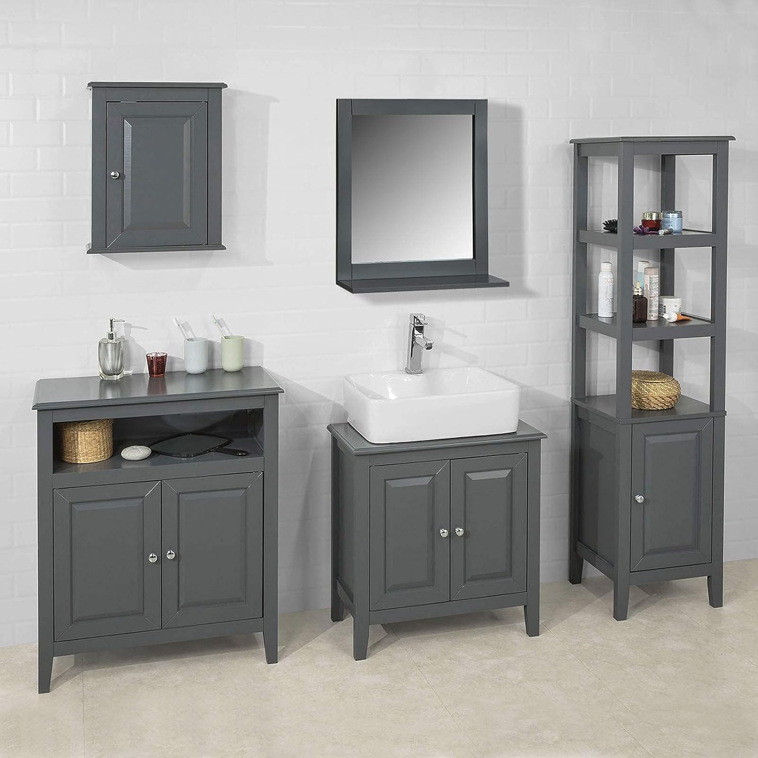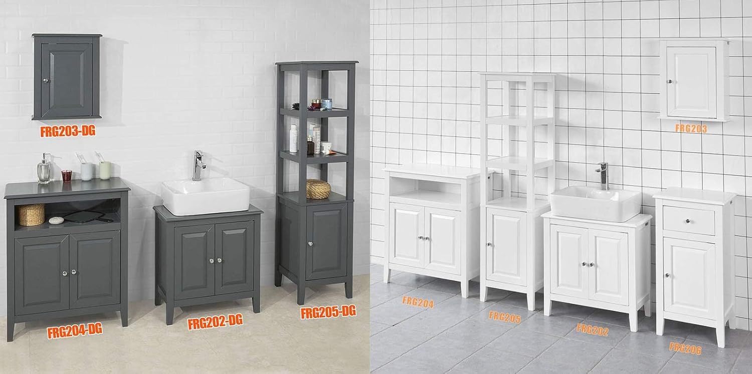 • Kann auch als 5-teiliges Set erworben werden: Badspiegel(BZR16-DG), Waschbeckenunterschrank(FRG202-DG), Wandschank(FRG203-DG), Badkommode (FRG204-DG), Hochschrank(FRG205-DG)