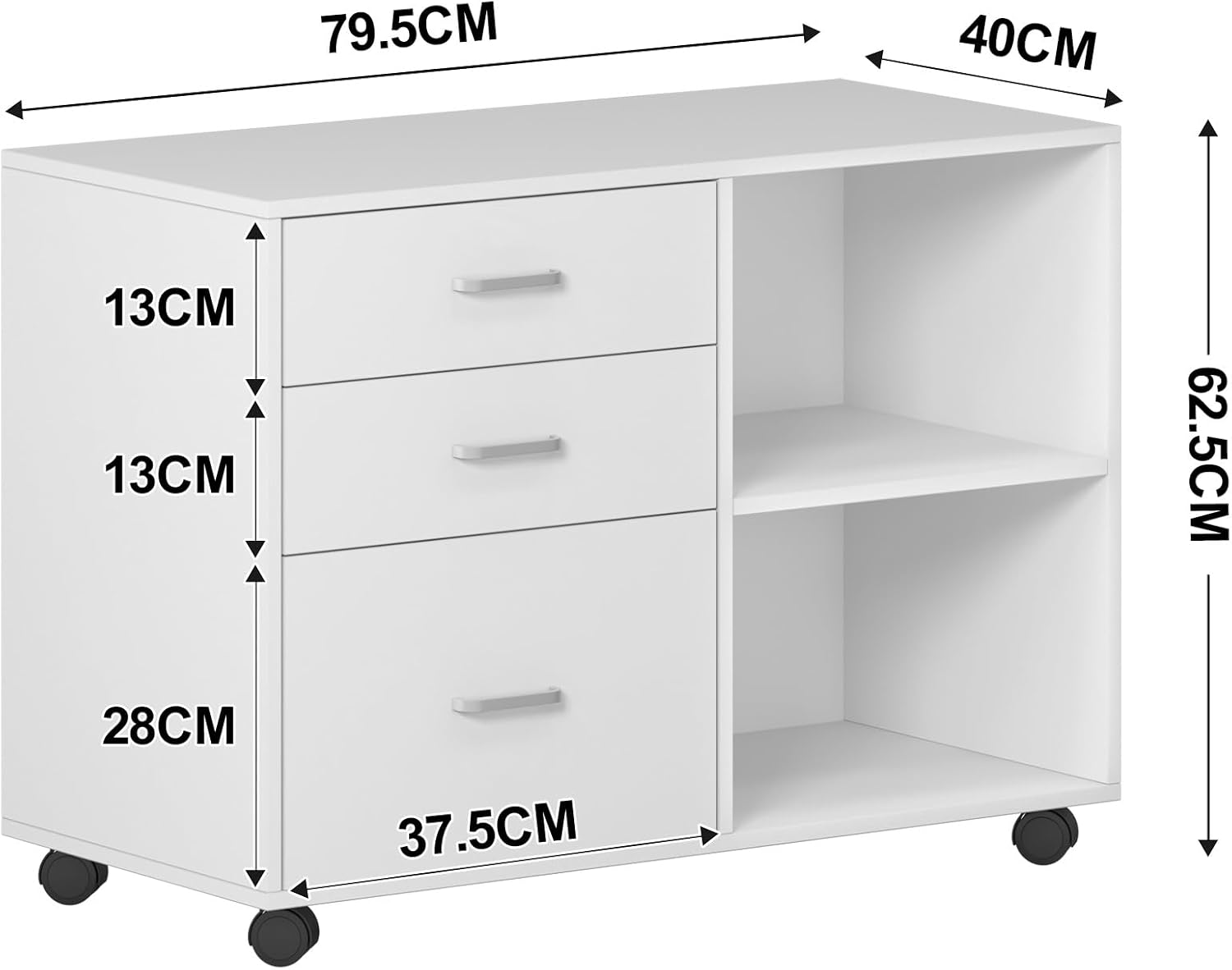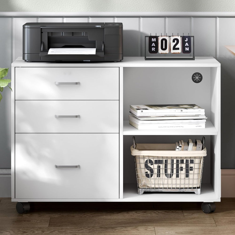 - 【Grosse Kapazität:】Neben 2 offenen Fächern verfügt der Aufbewahrungsschrank auch eine praktische Oberfläche, 3 Schubladen an Stauraum, um all Ihre Büroutensilien ordentlich zu verstauen; Durch 4 Universalräder (2 davon arretierbar) lässt sich
