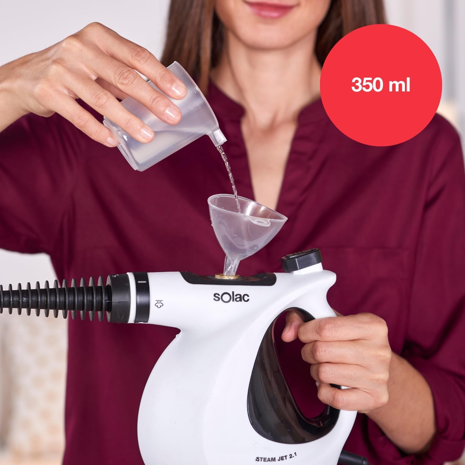 - 9 Zubehörteile im Lieferumfang enthalten: inklusive Verlängerungsrohr, Verbindungsstück, Stoffanschluss, konische Düse, schräge Düse, runde Bürste, Tuch, Messbecher und Trichter.