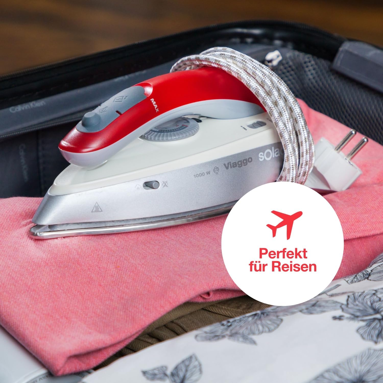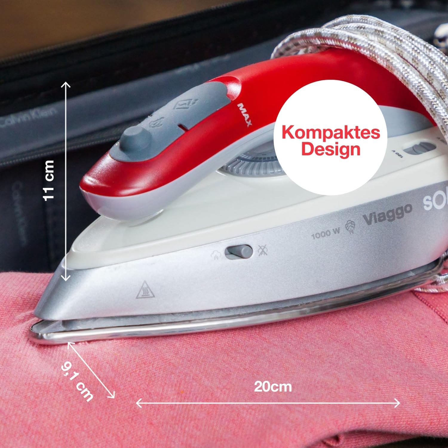 - Hohe Leistung: Maximale Leistung von 1100 W, damit Sie keine Zeit während Ihrer Reise verschwenden. Bügeln Sie Ihre Kleidung bequem und schnell mit dem Reisebügeleisen Viaggio Pro von Solac.