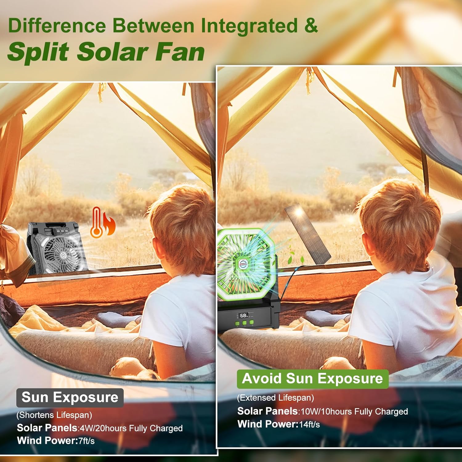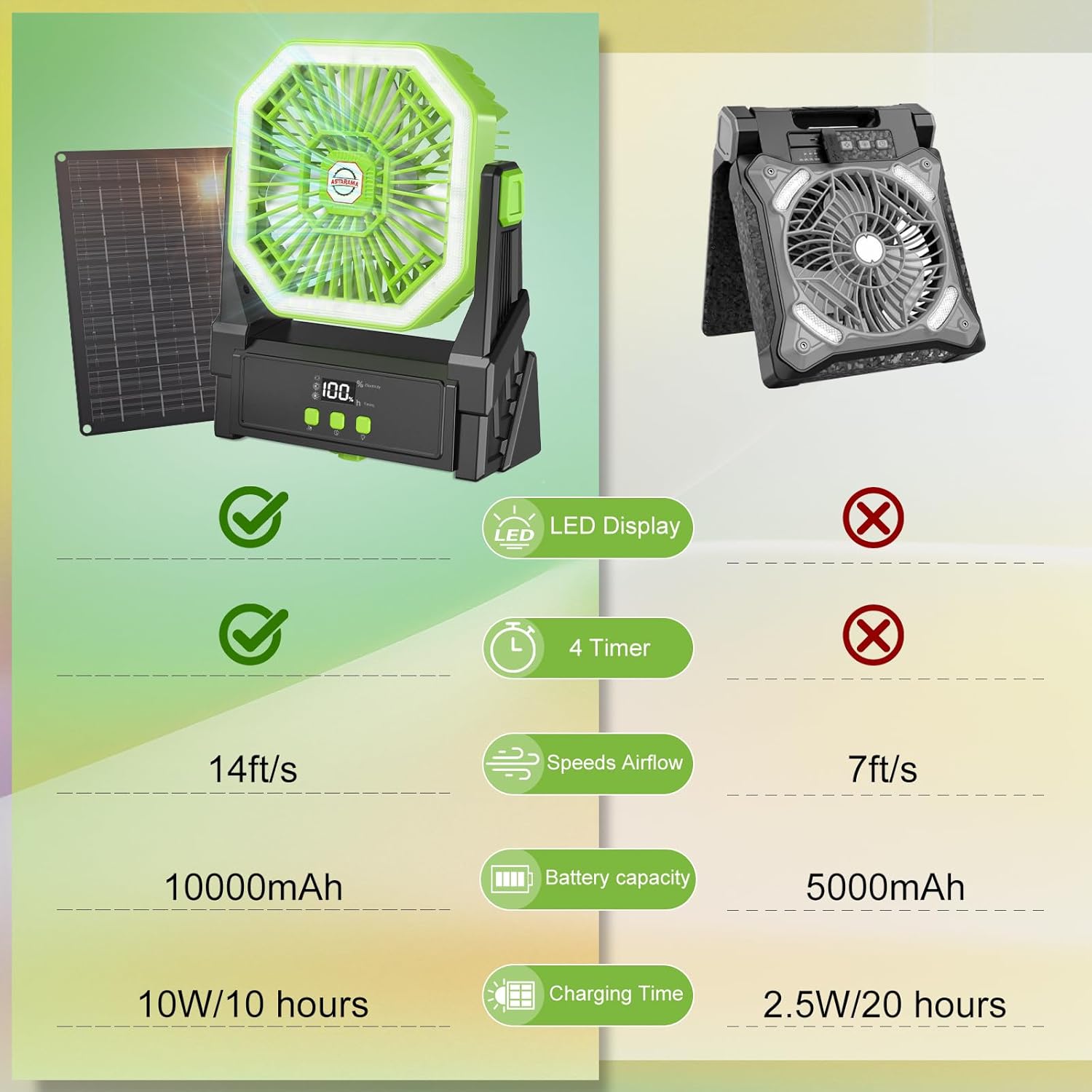 - 🌞【10W Hocheffizientes Solarpanel und Ventilator Akku mit LED-Anzeige】Mit einem beeindruckenden 10.000 mAh-Akku zeigt die gut lesbare LED-Anzeige die verbleibende Akkuladung für rechtzeitiges Aufladen an. Dieser camping ventilator mit 18X25CM